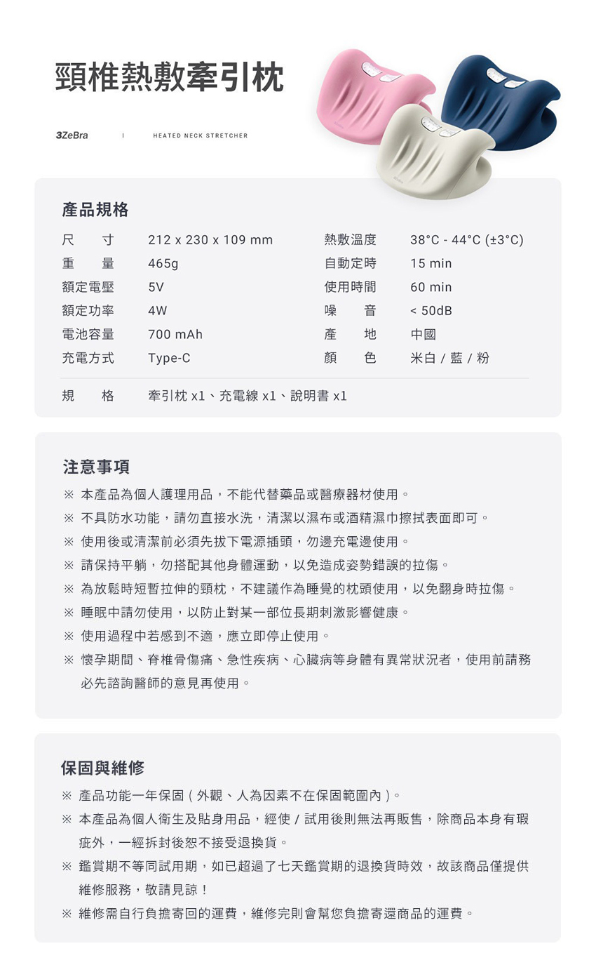 規格:牽引枕 x1、充電線 x1、說明書 x1