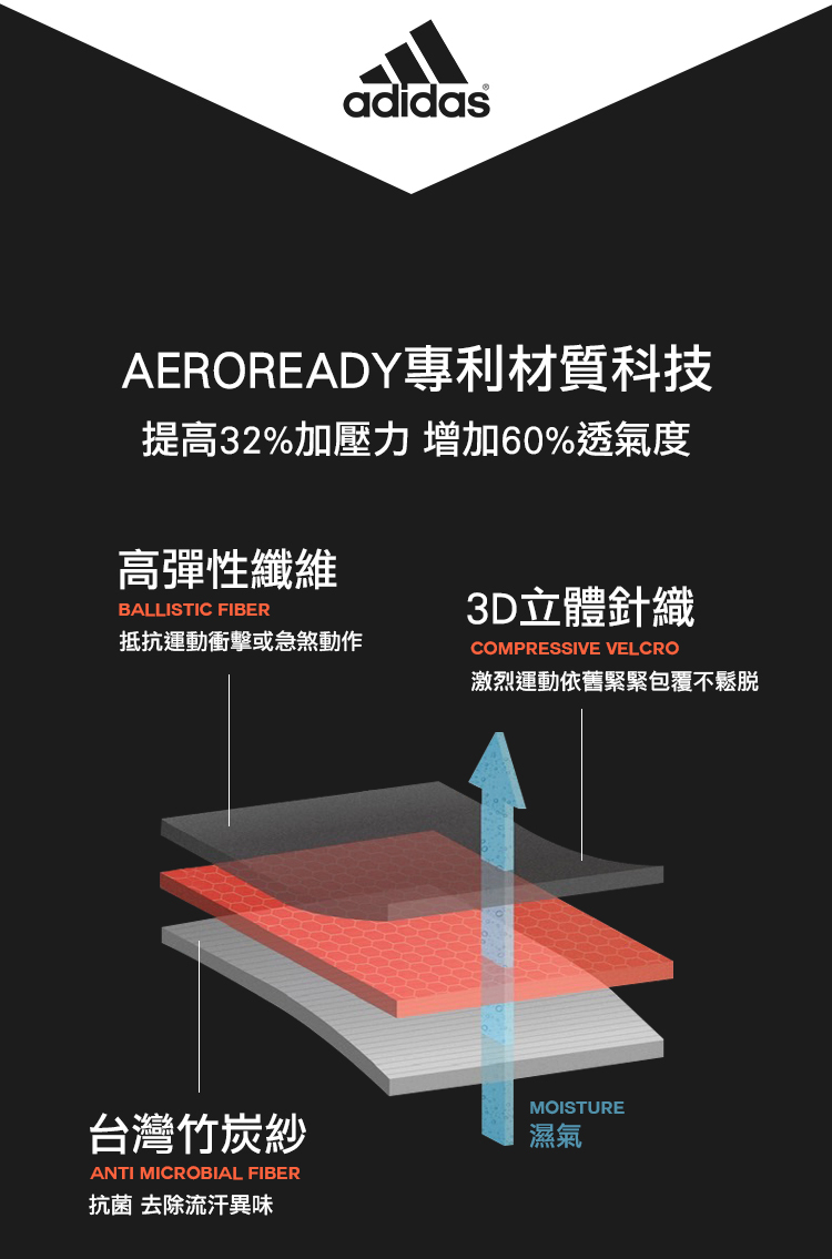 • 透氣不悶熱:獨家AEROREADY專利科技材質並結合台灣竹炭紗纖維,運動流汗時也不感覺過於黏膩或悶熱不適。