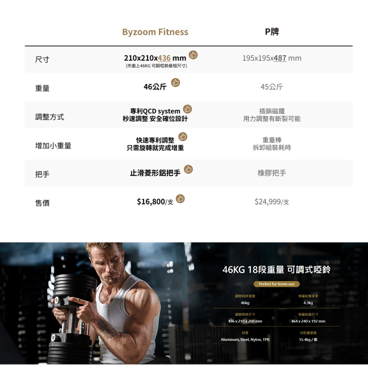 ‧ 一支包含46kg調整啞鈴x1、專屬底盤x1