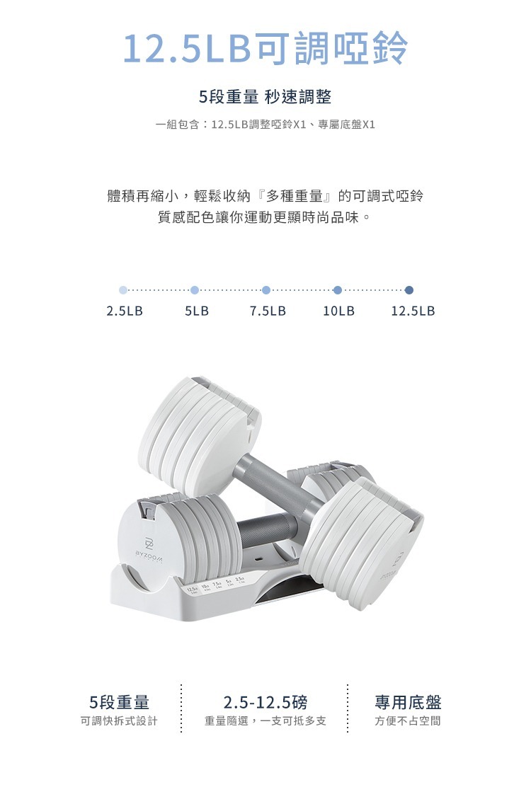 2.5、5、7.5、10、12.5 LB 五段重量秒速調整,5 in 1 調整啞鈴