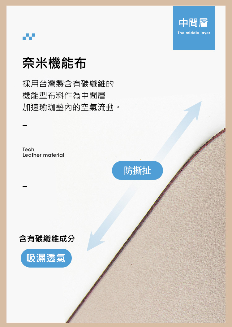 - 採用台灣製機能型布料作為中間層加速瑜珈墊內的空氣流動。