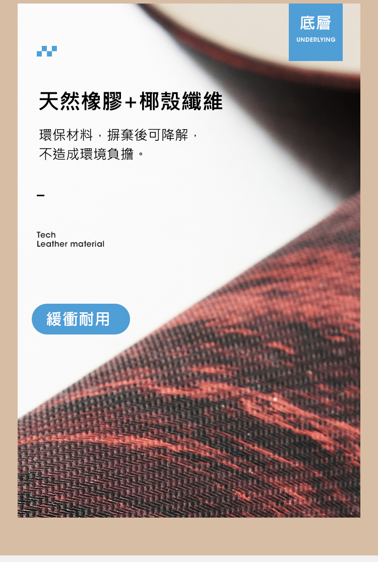 - 採用FSC認證有機天然橡膠,結合椰子殼纖維及碳纖維,彈性更好、更耐磨。
