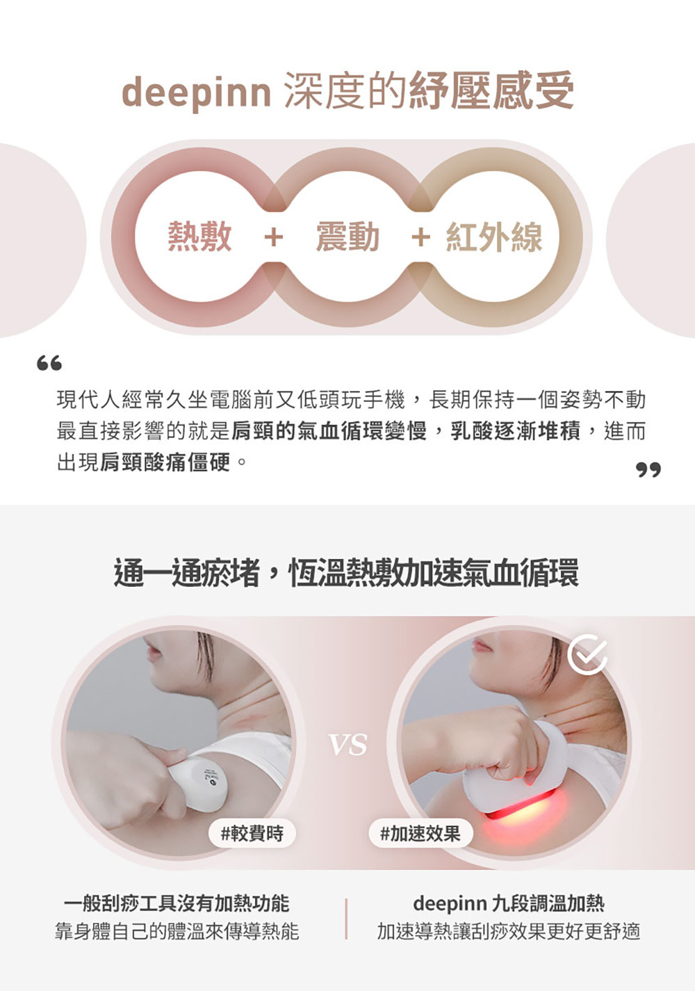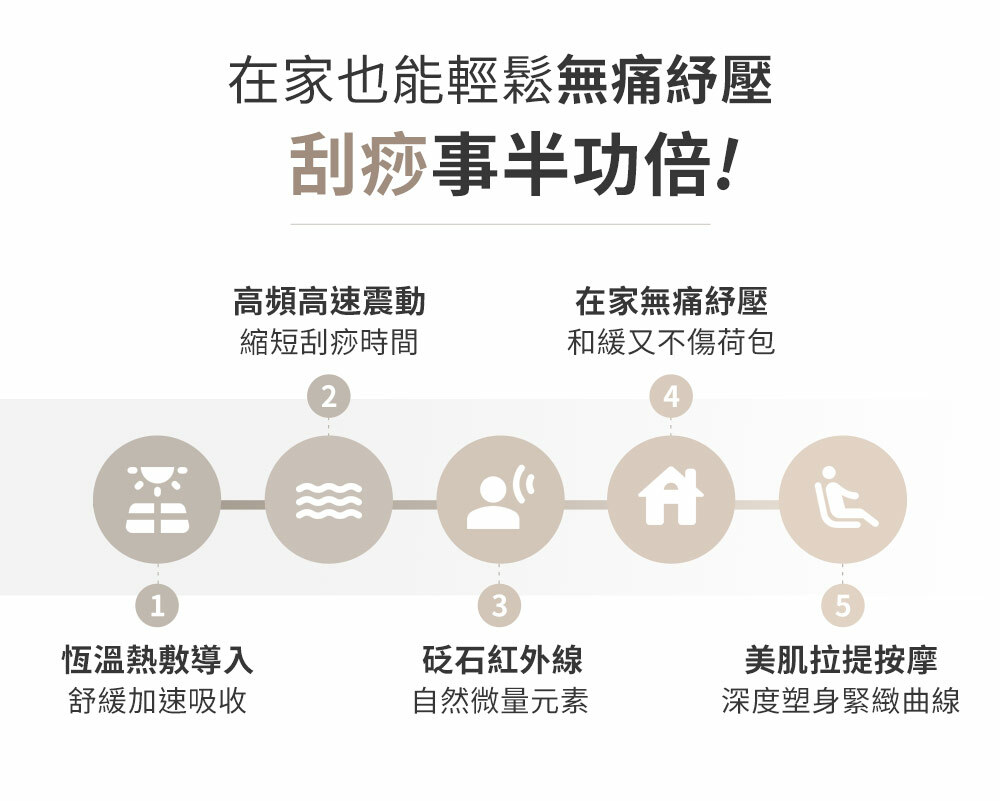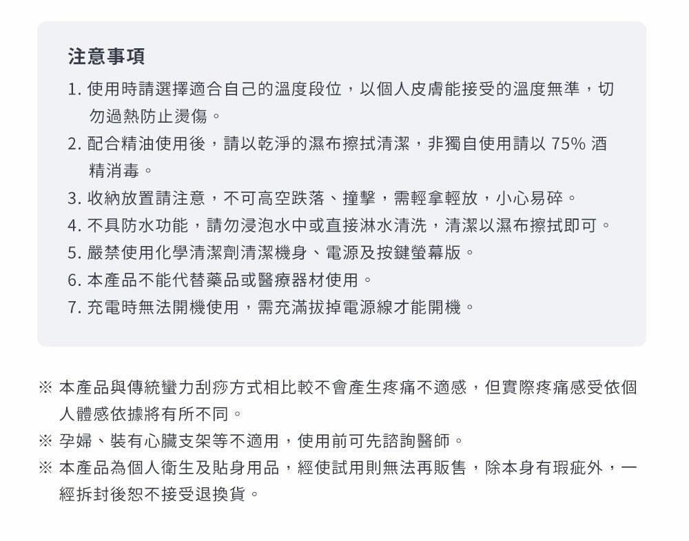 注意事項:※ 與傳統蠻力刮痧方式相比較不會產生疼痛不適感,但實際疼痛感受依個人體感依據將有所不同。