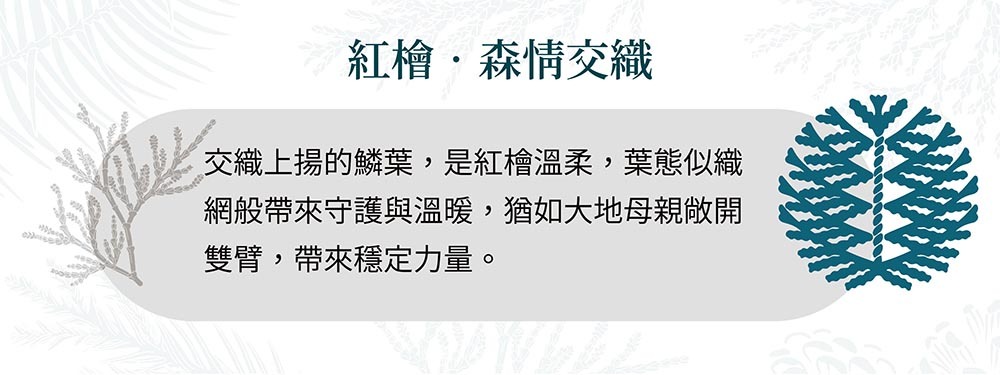 漫步森林的靜美,聆聽樹的話語裡所透漏的千年故事,感受那大自然不求回報的溫柔撫慰。交織上揚的麟葉,是紅檜的溫柔,葉態似織網般帶來守護與溫暖,猶如大地母親敞開雙臂帶來穩定力量。