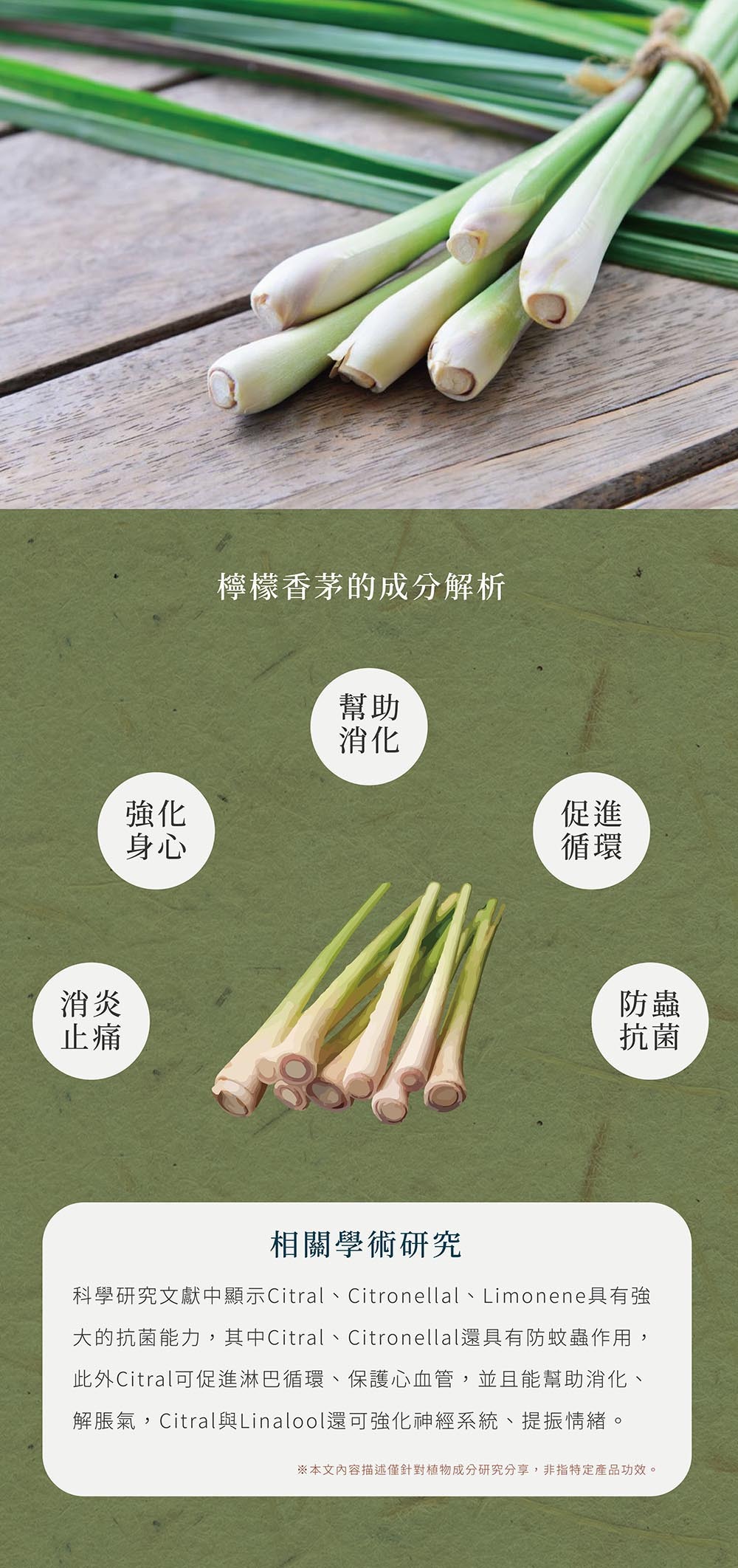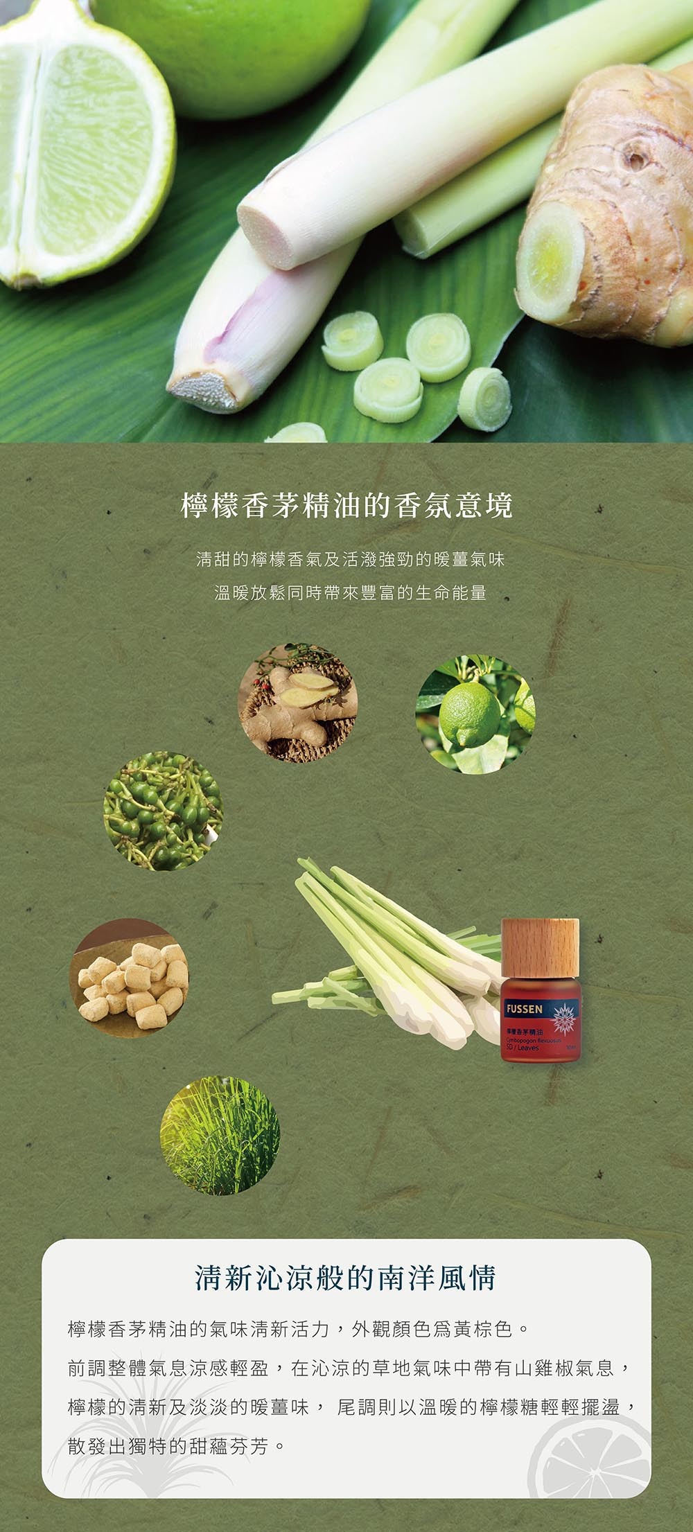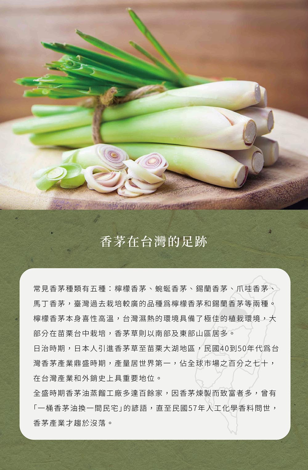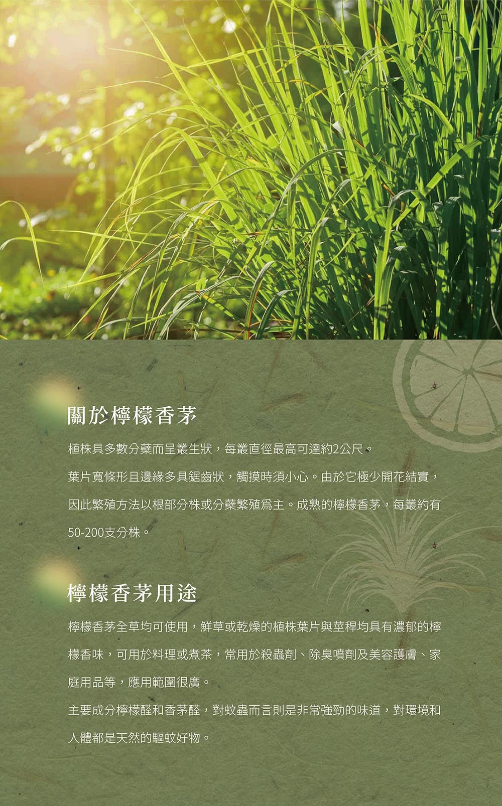 檸檬香茅為多年生草本植物,主要指於西印度及錫蘭地區的香茅種類,植物根部外觀類似筊白筍或大蔥,莖葉部分有新鮮草葉香還有檸檬的香氣,故也有檸檬草之稱。廣泛的栽培在熱帶及亞熱帶地區,除可當辛香料,還可做驅蟲劑和藥材,用途甚廣。