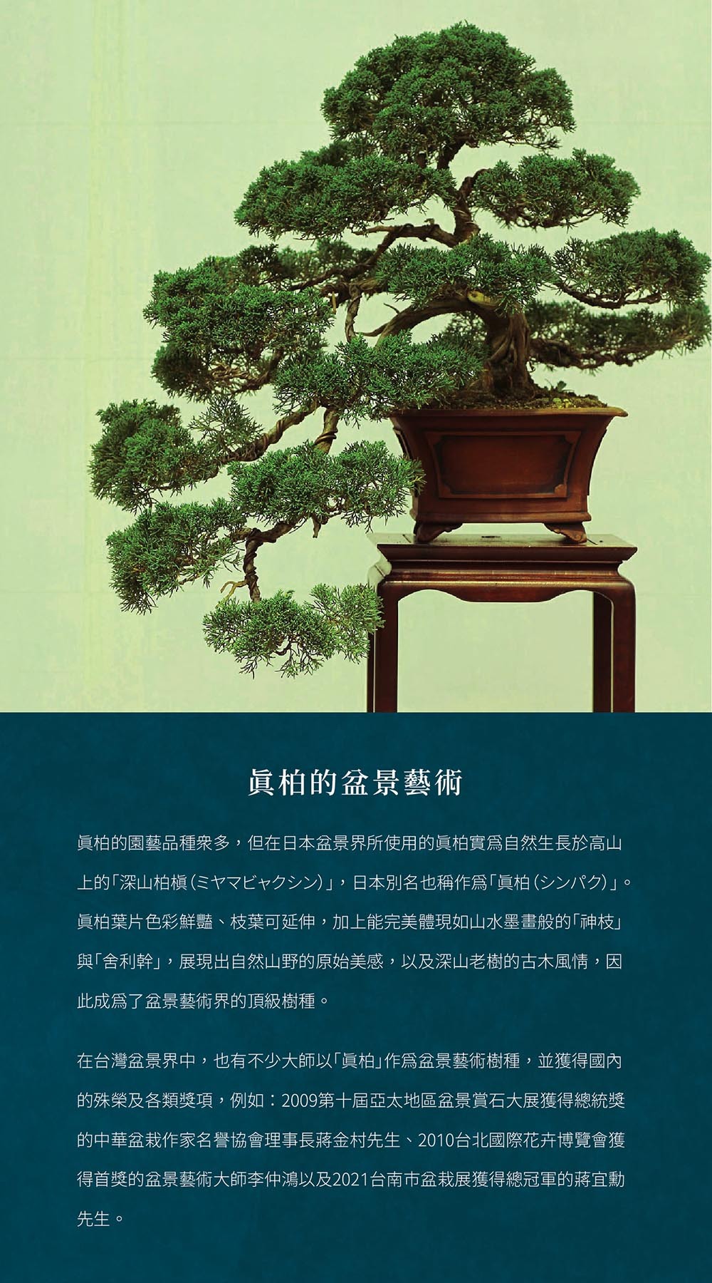 真柏是一種多變的針葉常綠喬木或灌木,可作為庭園樹、盆景樹、甚至是聖誕節裝飾樹等,其葉片呈現鱗狀、針狀,並具有特殊香氣,是台灣近年來頗受歡迎的園藝樹種。