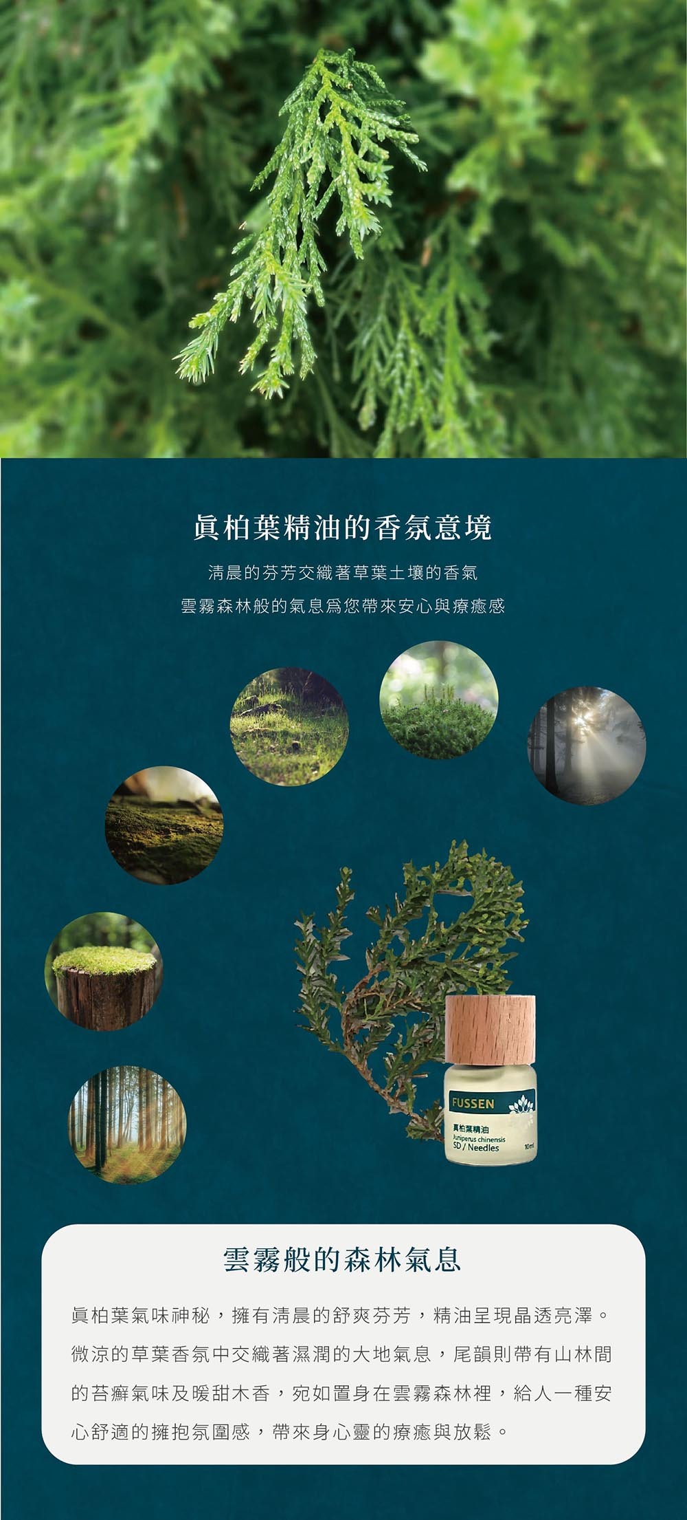 真柏葉擁有清晨的芬芳,精油呈現晶透亮澤,清涼的草葉香氛中交織著濕潤的大地氣息,尾韻則帶有山林間的苔癬氣味及暖甜木香,宛如置身在雲霧森林中,賦予安心療育的擁抱感。