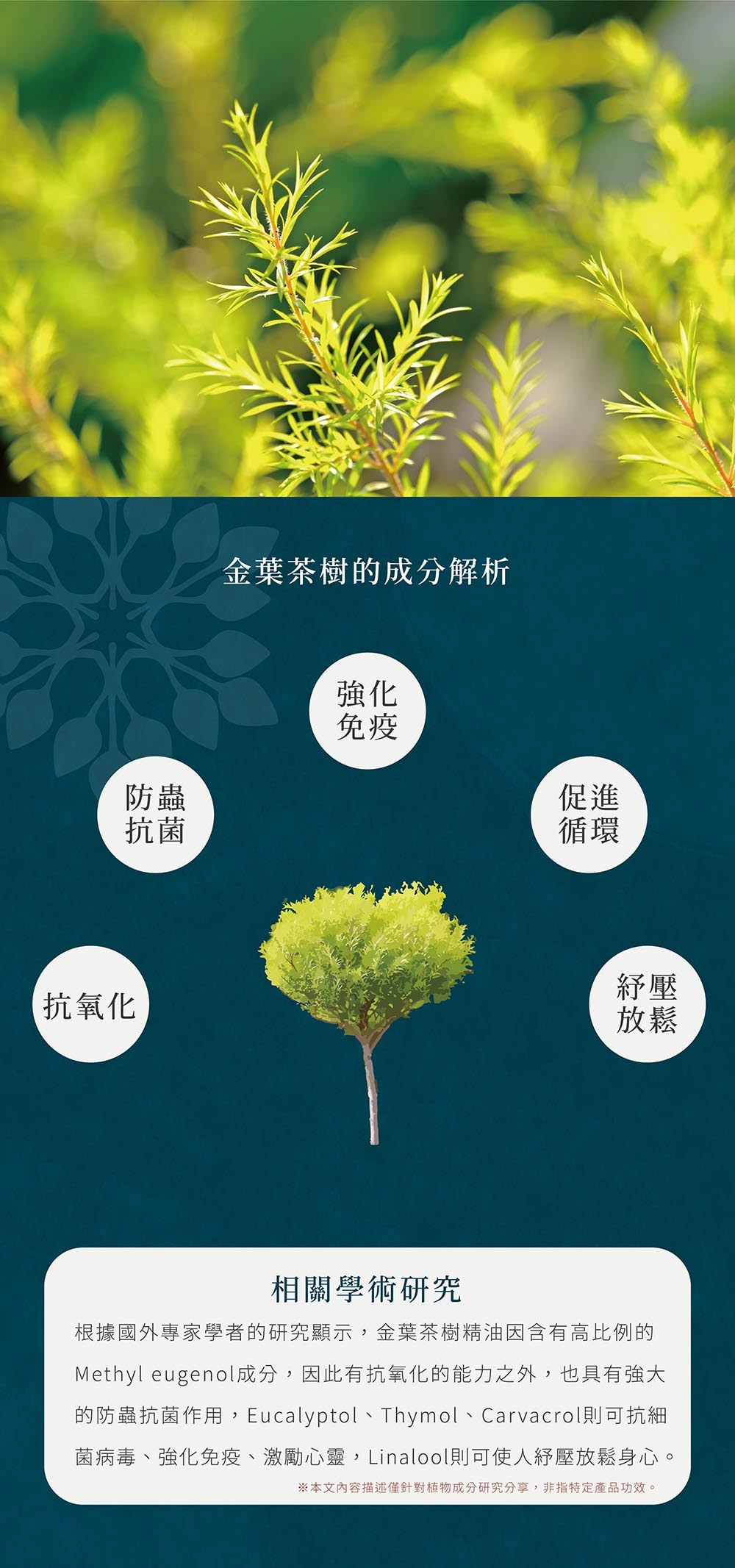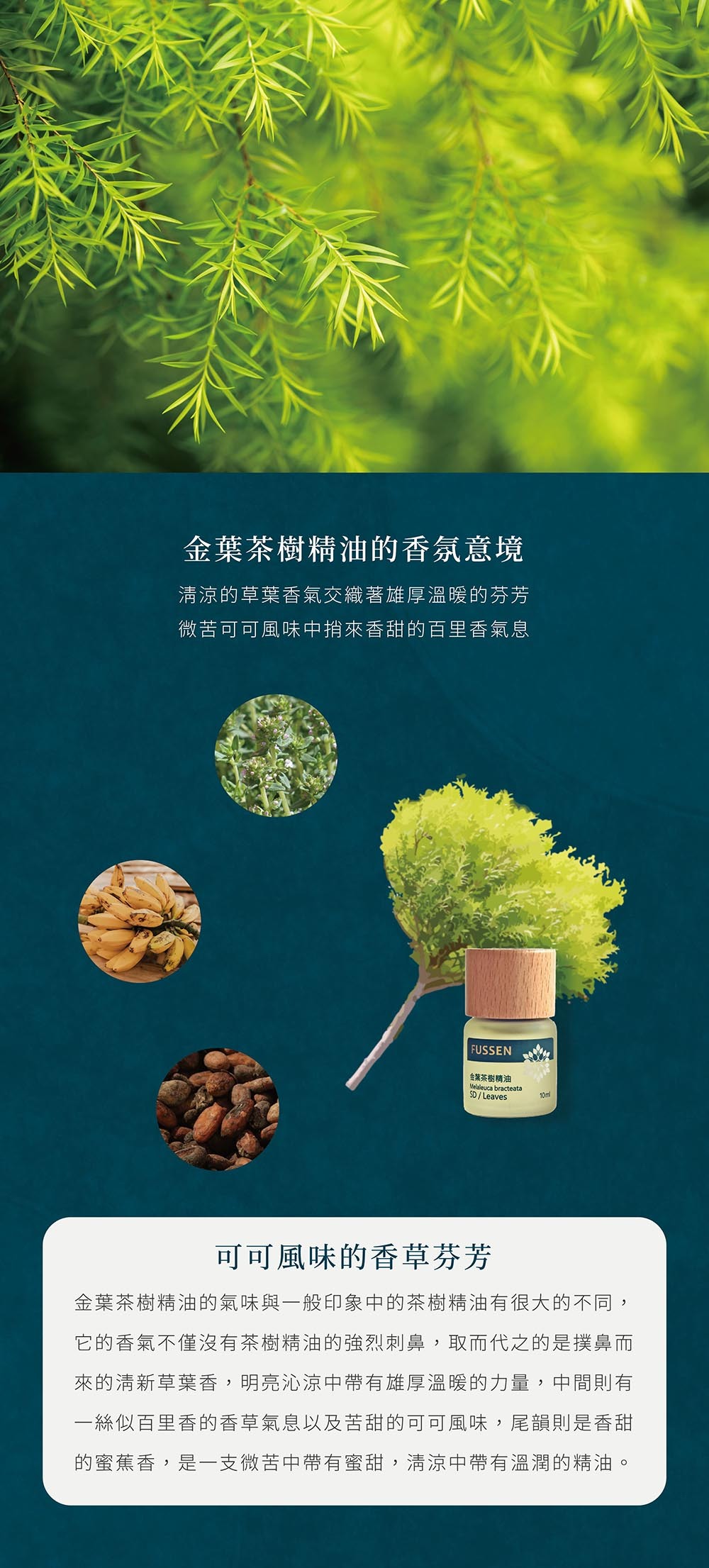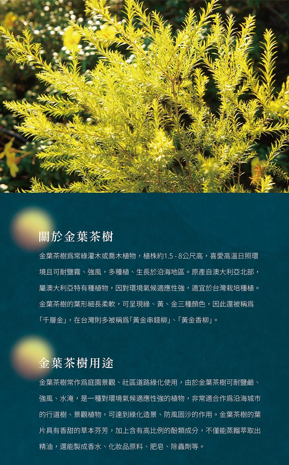 金葉茶樹原是澳大利亞北部地區的特有種植物,由於它對於環境、氣候適應性強,加上喜愛高溫日照的特性,非常適宜於台灣栽培種植。福森永續與台灣在地有機農場合作,將金葉茶樹透過蒸餾萃取出精油,為您獻上帶有可可風味與草本香氣的天然芬芳。