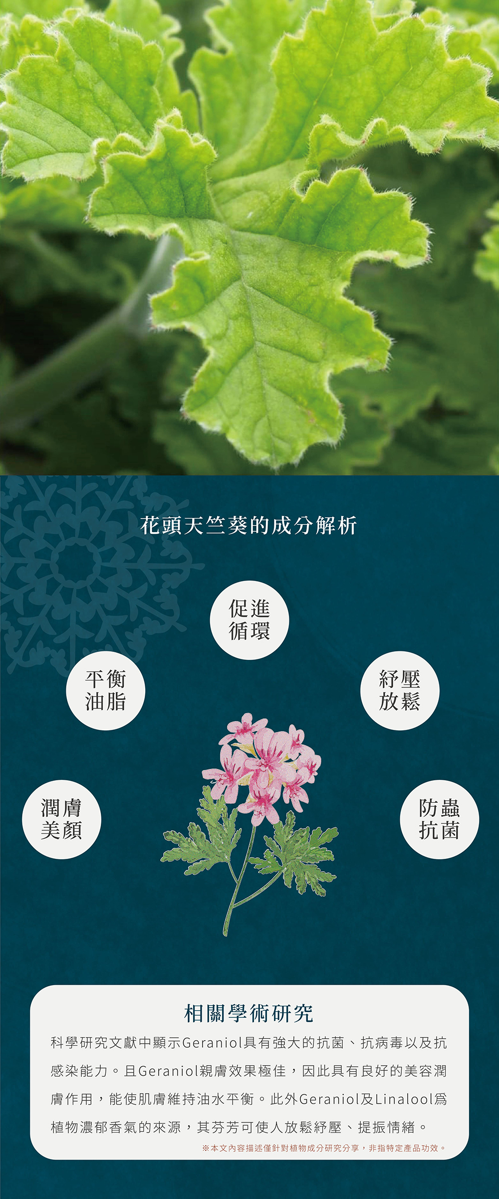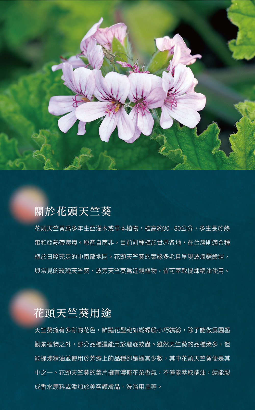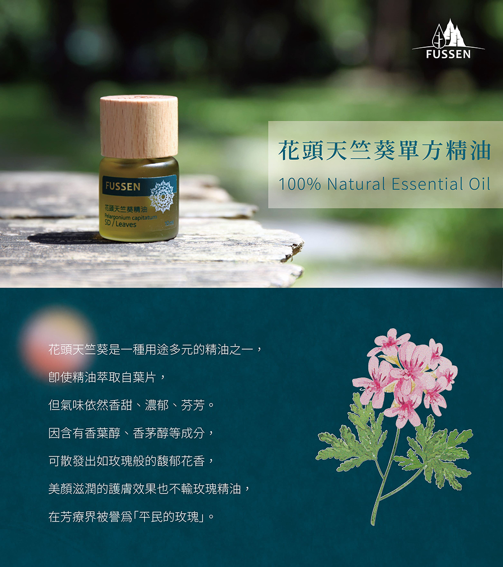 花頭天竺葵是一種用途多元的精油之一,即使精油萃取自葉片,氣味依然香甜、濃郁、芬芳。因含有香葉醇、香茅醇等成分,可散發出如玫瑰般的馥郁花香,美顏滋潤的護膚效果也不輸玫瑰精油,在芳療界被譽為「平民的玫瑰」。