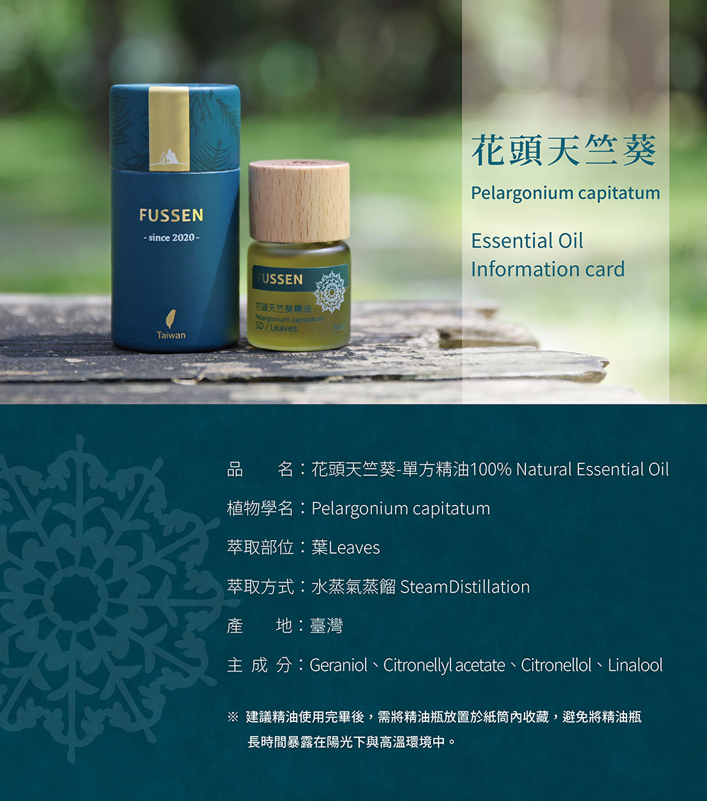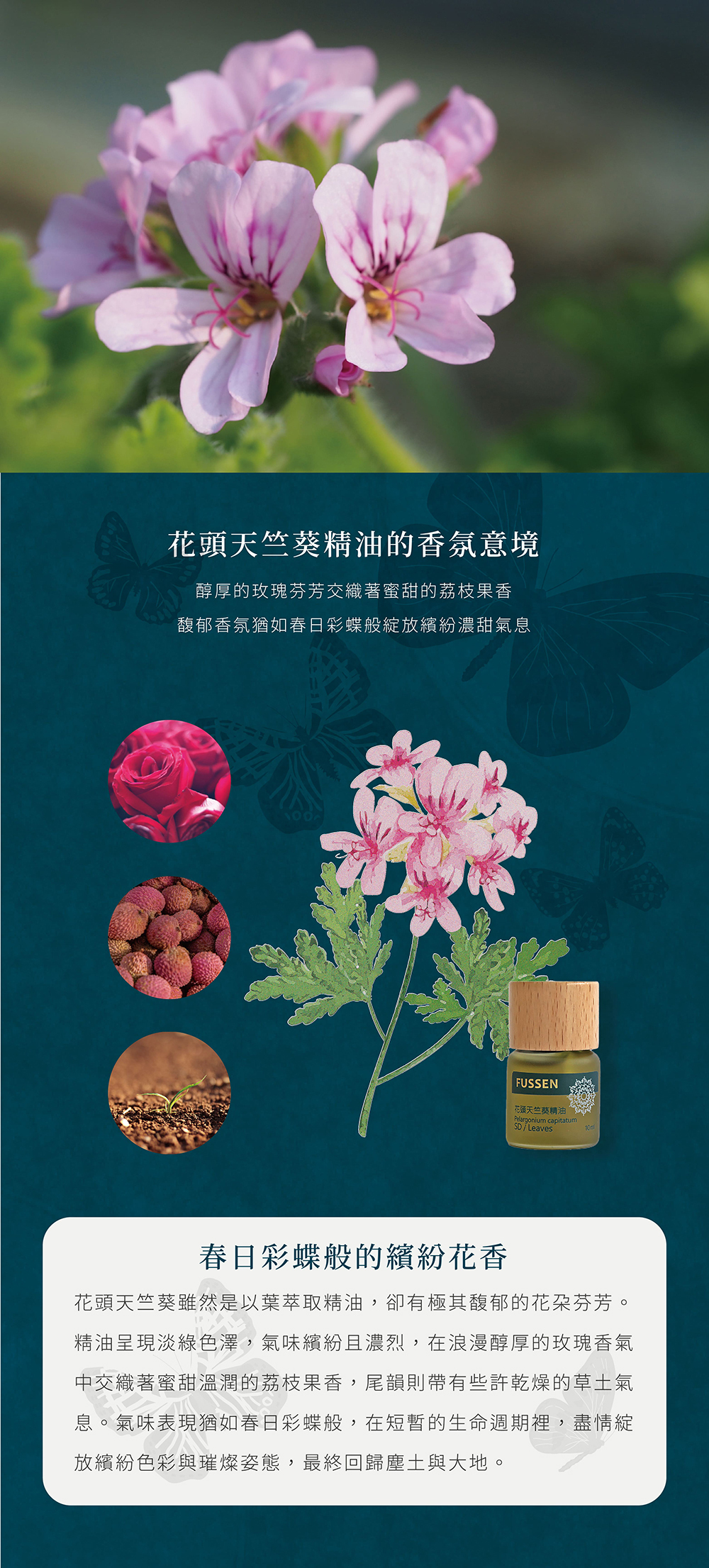 福森嚴選自台灣有機農場植栽、萃取的花頭天竺葵精油,其色澤呈淡綠色,馥郁香氛猶如春日彩蝶般綻放繽紛濃甜的氣息,在醇厚的玫瑰芬芳中交織著蜜甜的荔枝果香,尾韻則帶有些許乾燥的草土氣息。