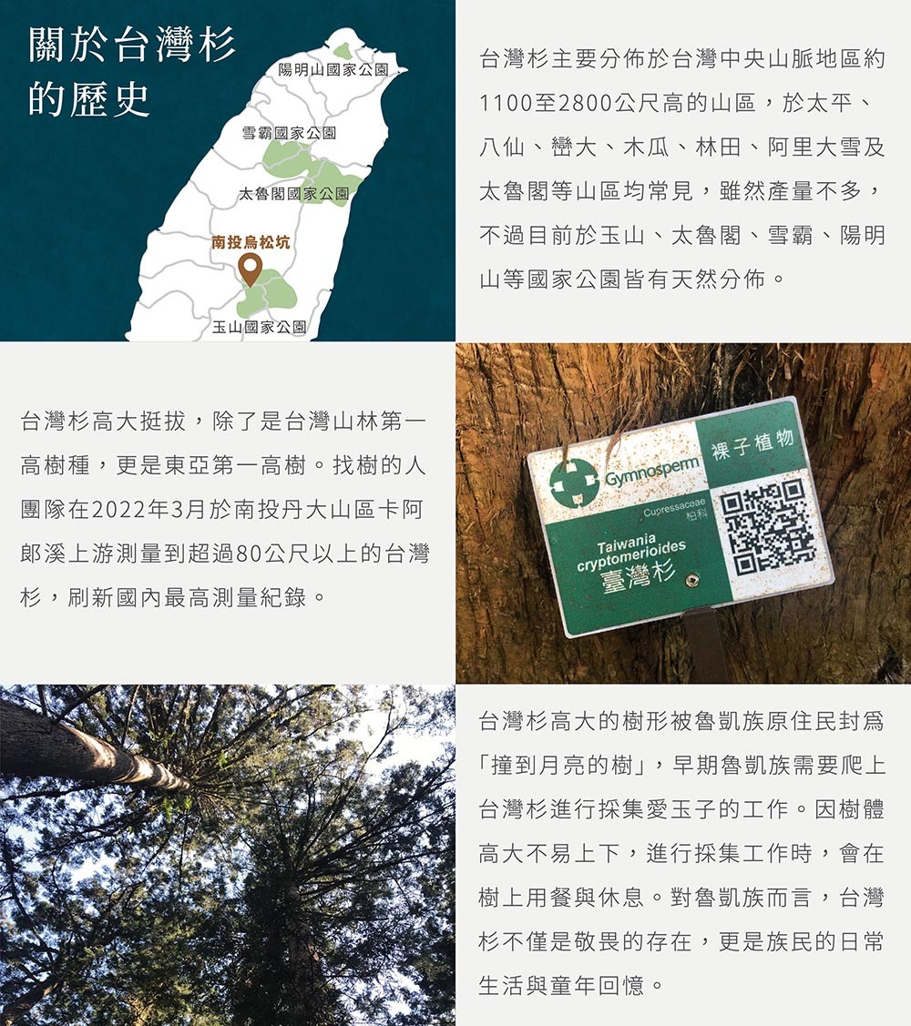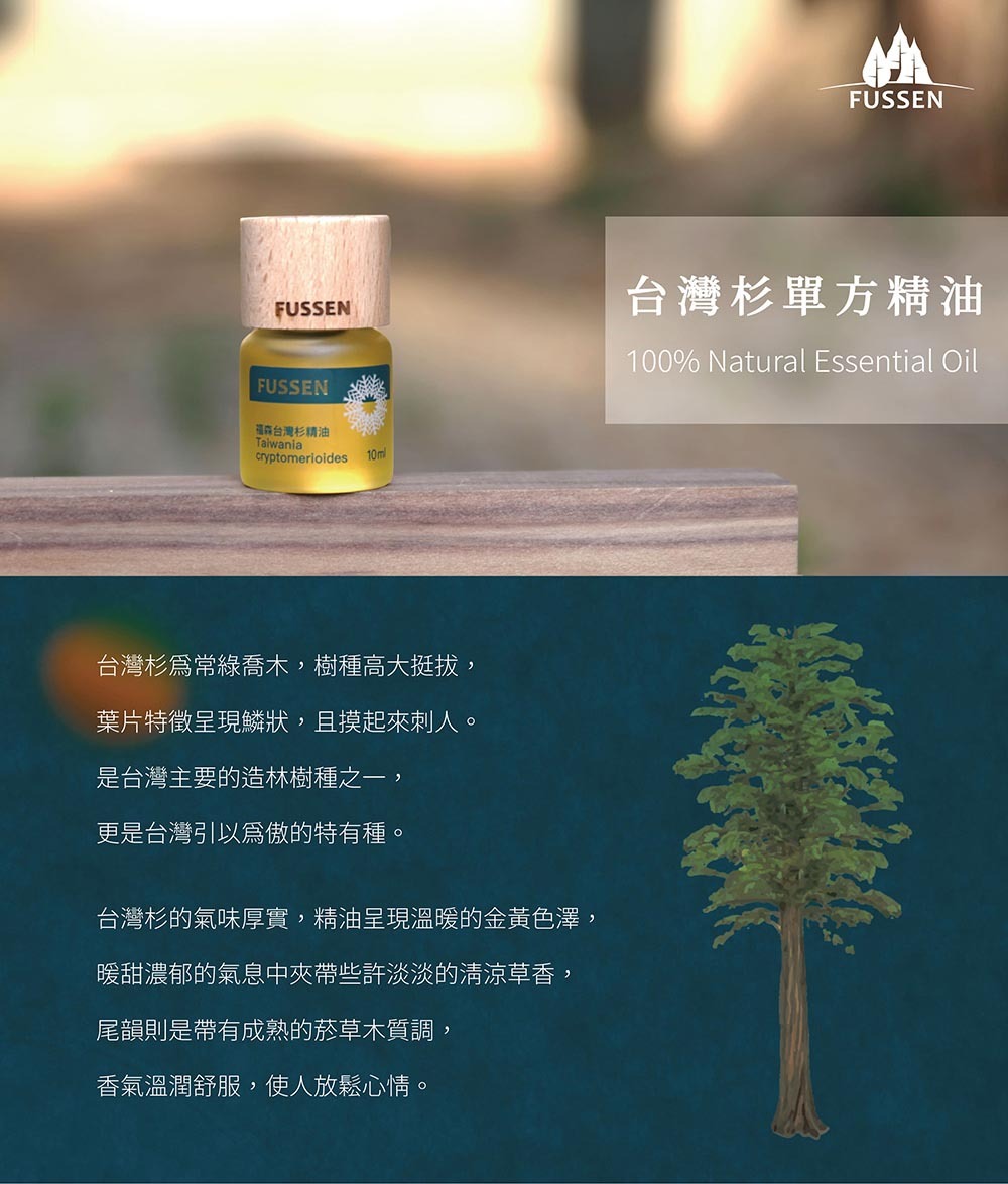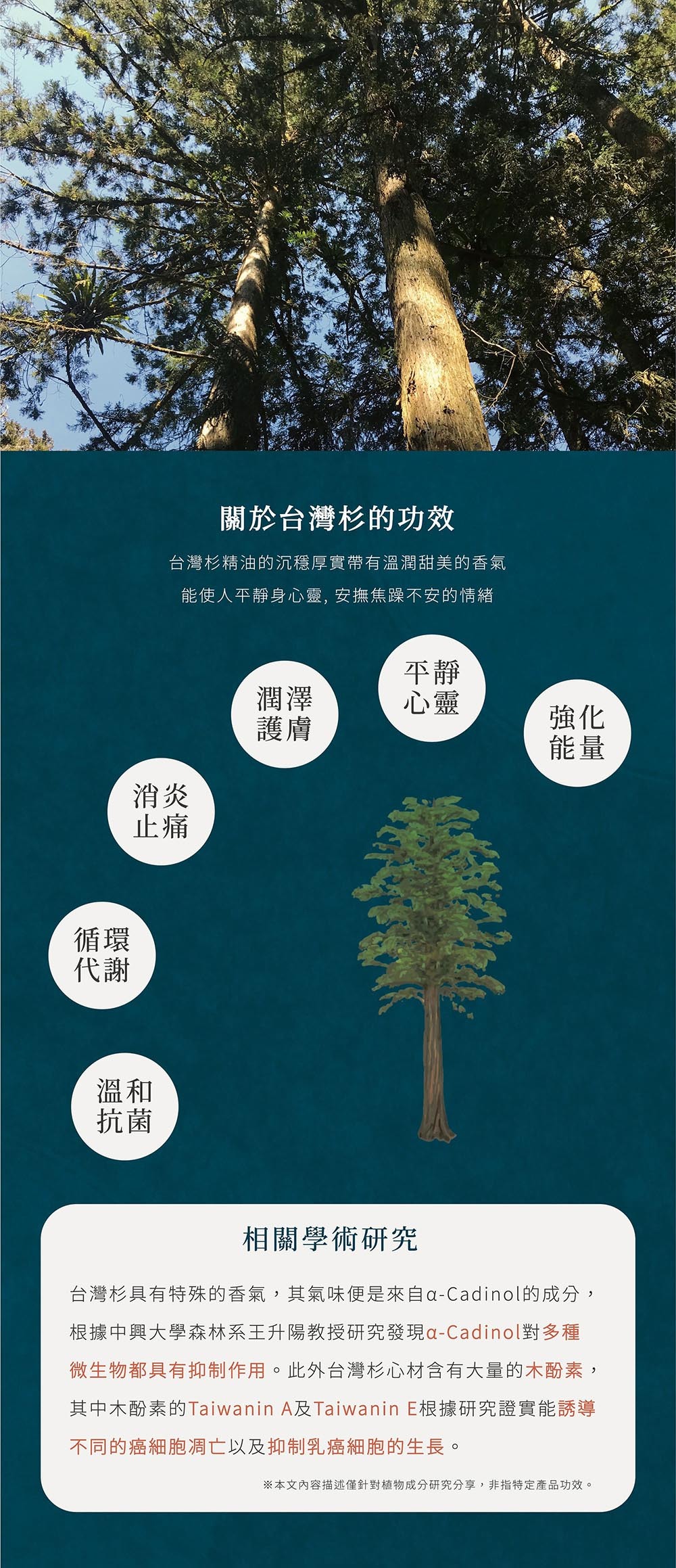 台灣杉為台灣特有樹種,是台灣針葉五木之一,被譽為台灣針葉樹王,並有台灣爺之稱。高大的樹形被魯凱族原住民封為「撞到月亮的樹」,是台灣山林第一高樹種,也是東亞第一高樹。台灣杉的氣味厚實,精油呈現溫暖的金黃色澤,暖甜濃郁的氣息中夾帶些許淡淡的清涼草香,尾韻則是帶有成熟的菸草木質調,香氣溫潤舒服。