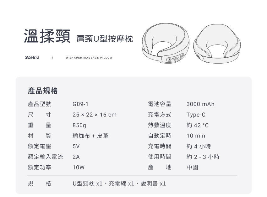 規 格:U型頸枕 x1、充電線 x1、說明書