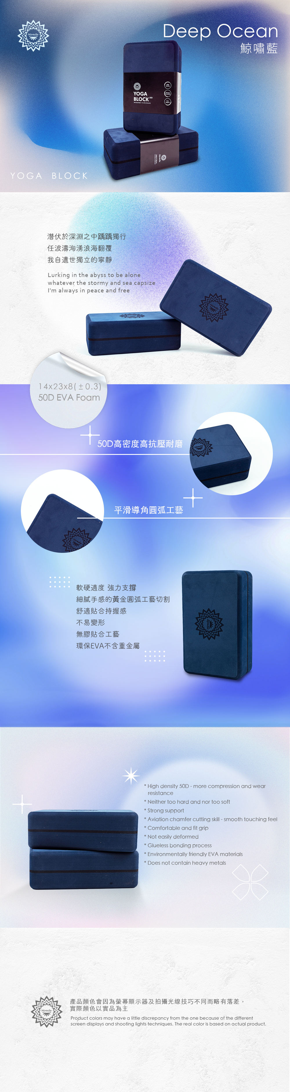 Miracle墨瑞革 一體成形環保高密度瑜珈磚50D 鯨嘯藍