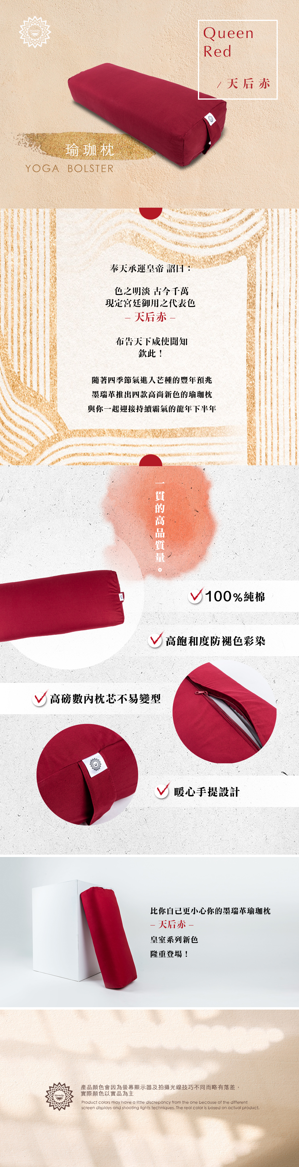 - 瑜珈外枕套,經洗滌後將會1%~3% 的縮率,屬自然現象。
