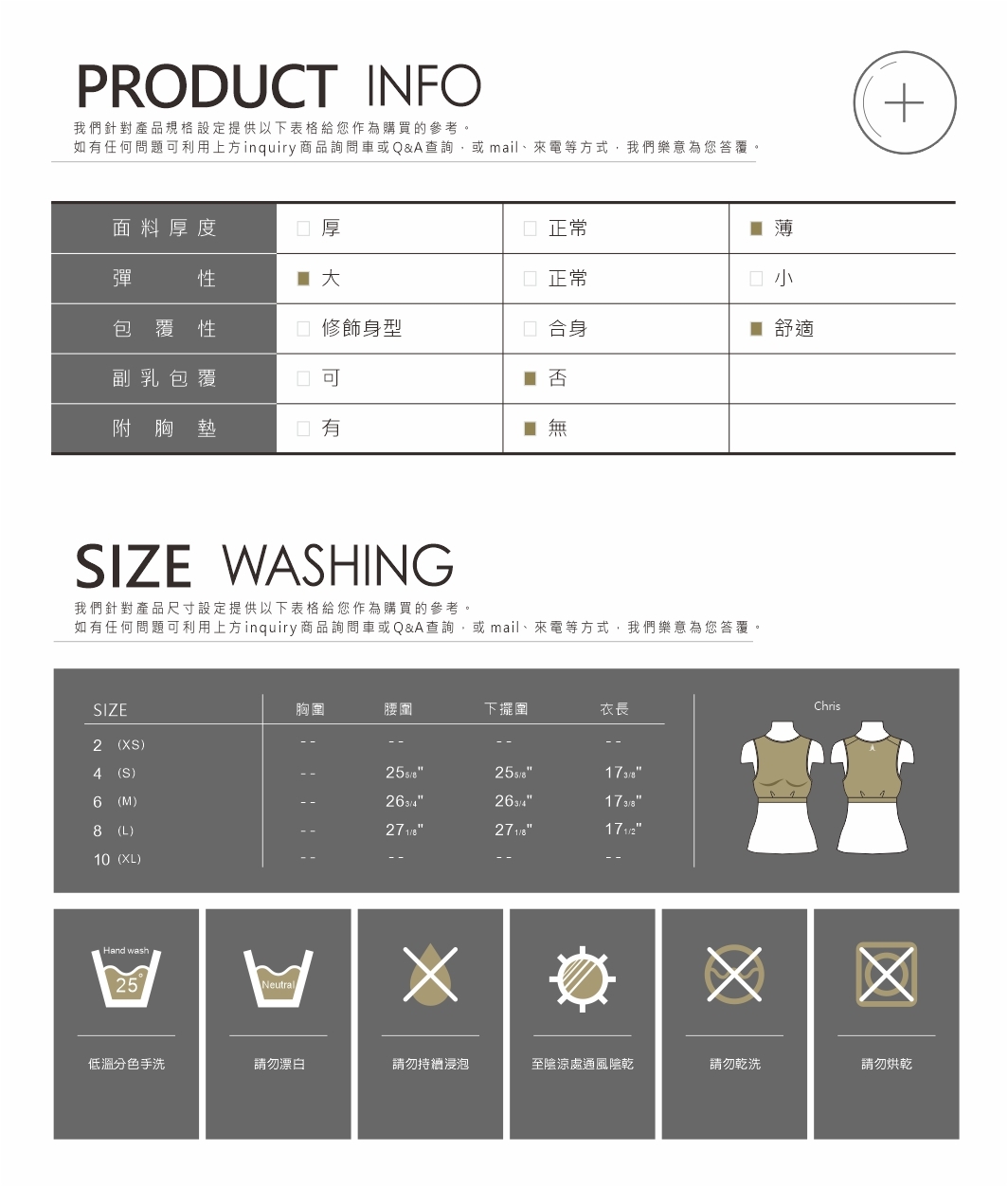 2.試穿時如有化妝請特別小心,若衣物上沾有粉妝時,將會收取商品清潔費,如沾染情況嚴重,恕無法受理退換貨。
