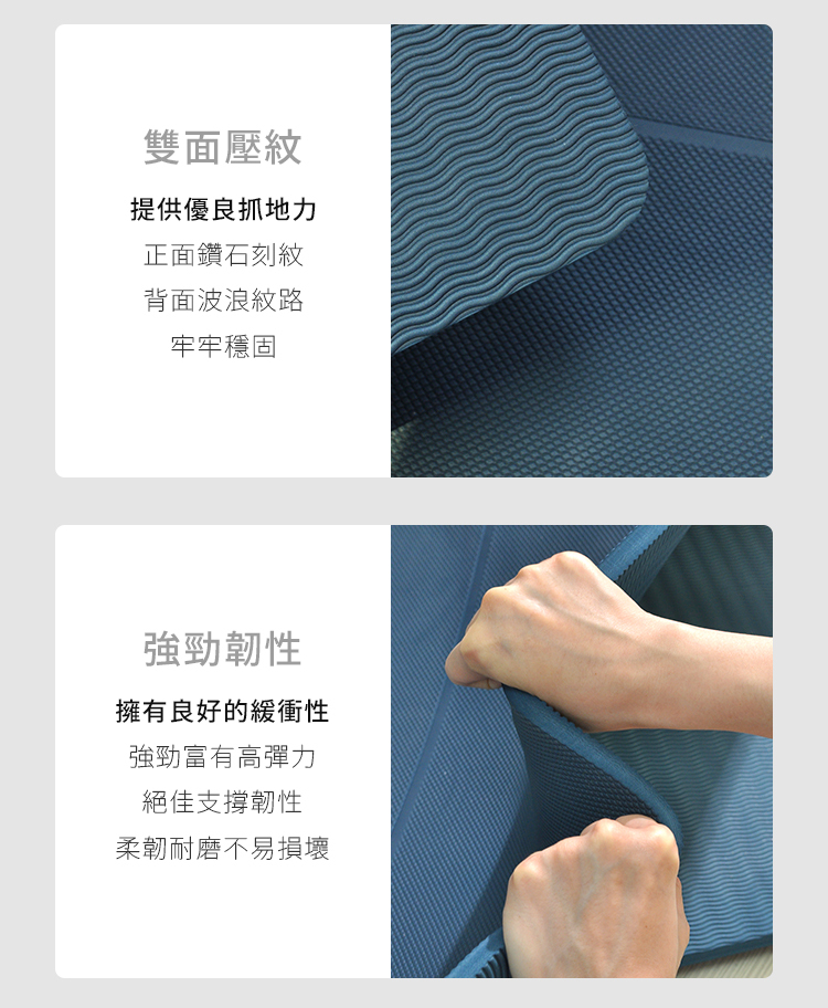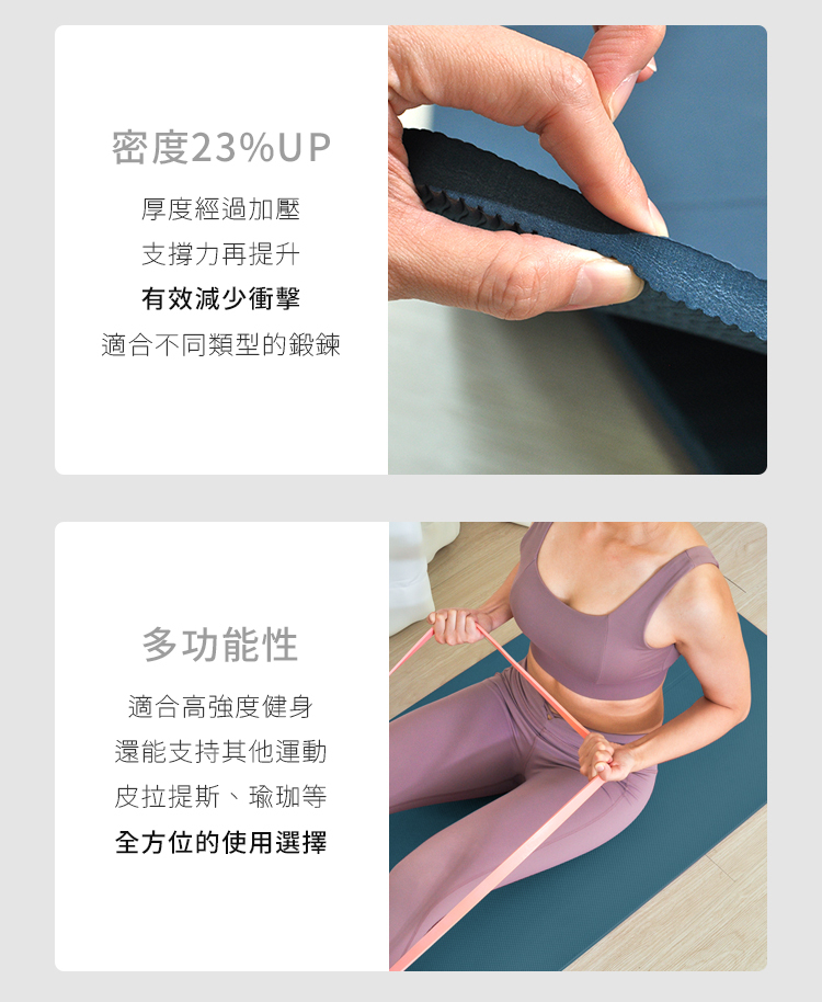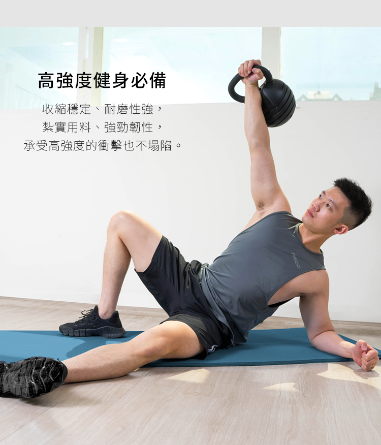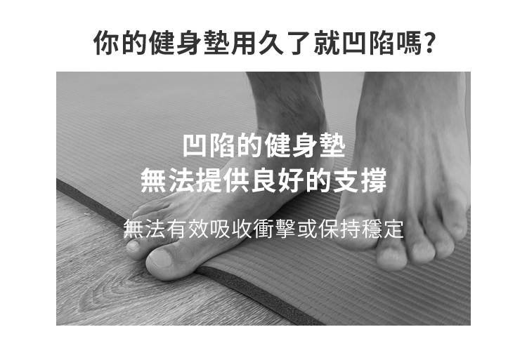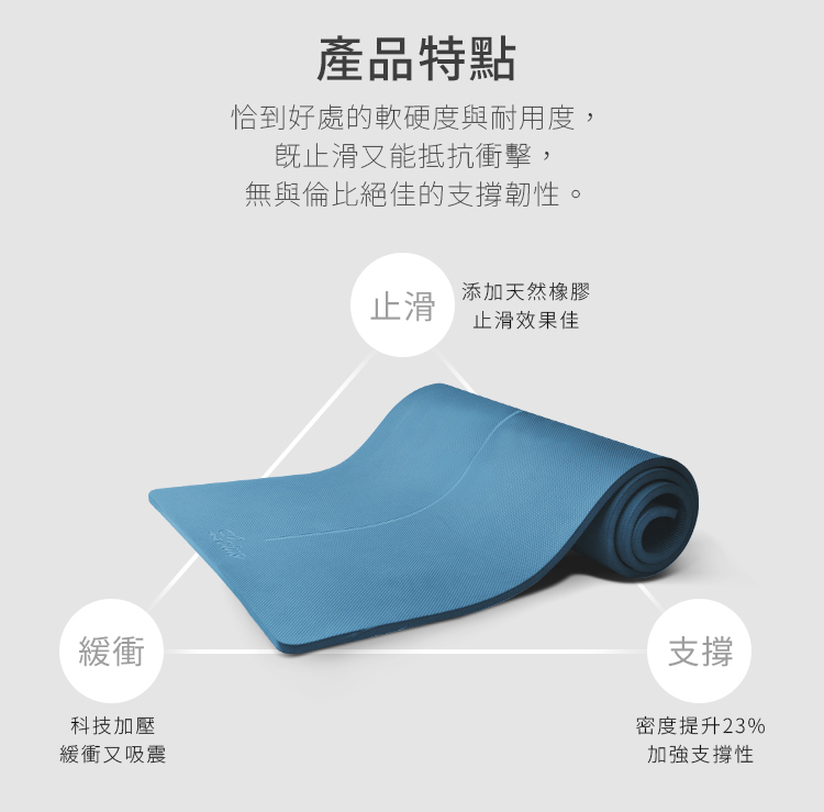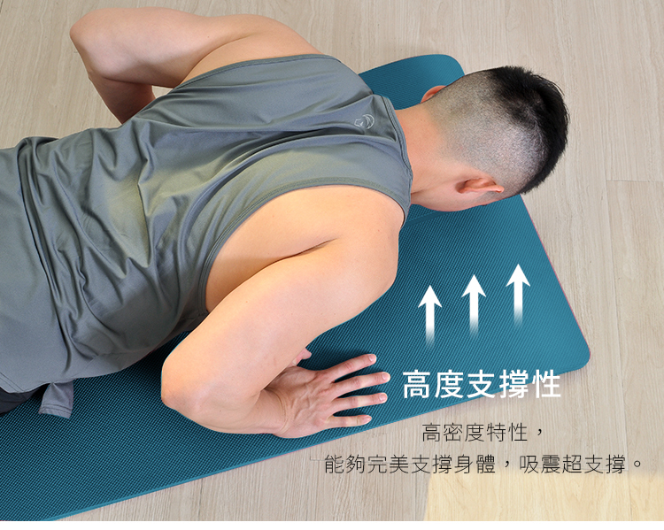 健身墊強調厚度及支撐力、緩衝、減震、止滑,以提升訓練時的舒適性,保護我們的身體,減少關節疼痛感與運動傷害發生機率。