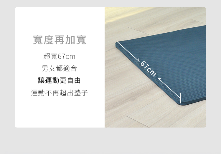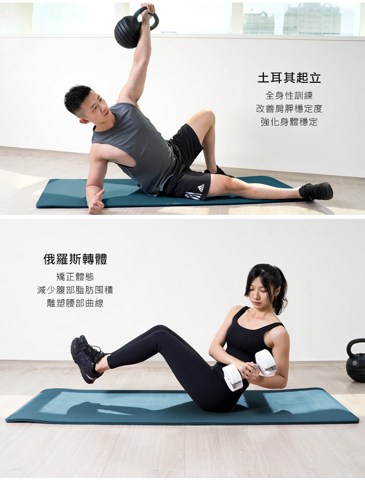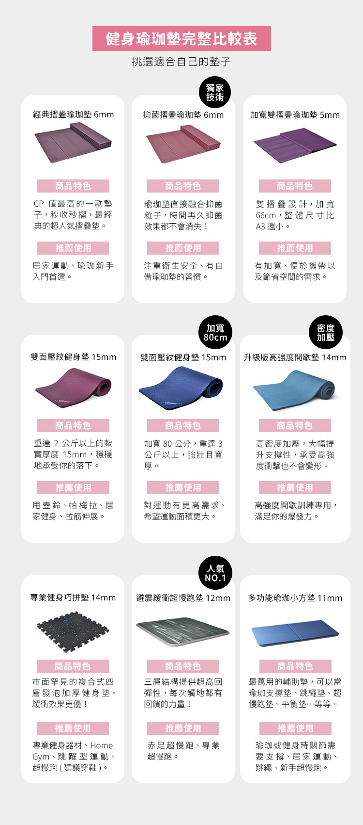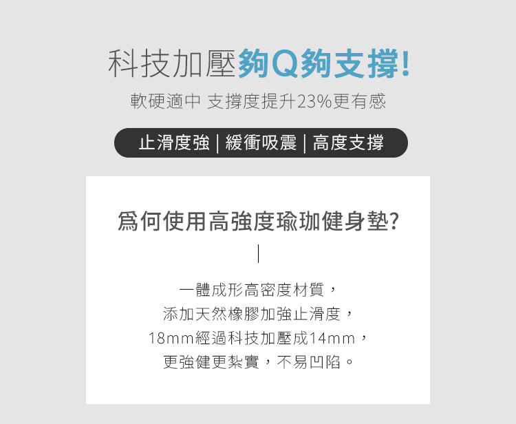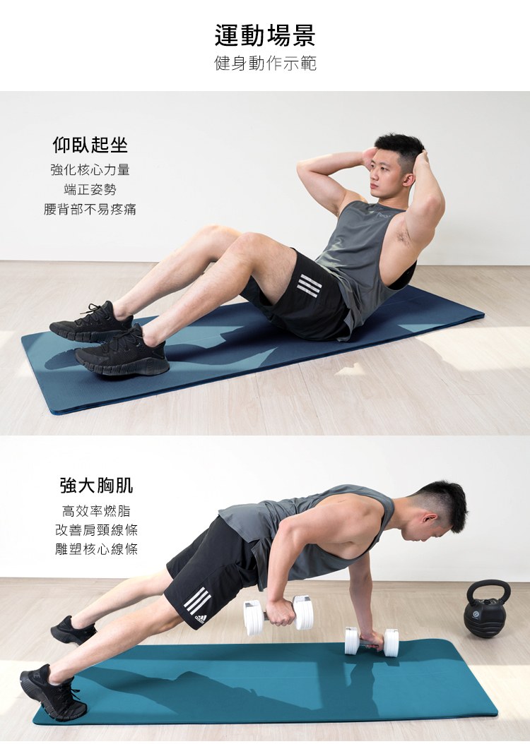 健身墊強調厚度及支撐力、緩衝、減震、止滑,以提升訓練時的舒適性,保護我們的身體,減少關節疼痛感與運動傷害發生機率。
