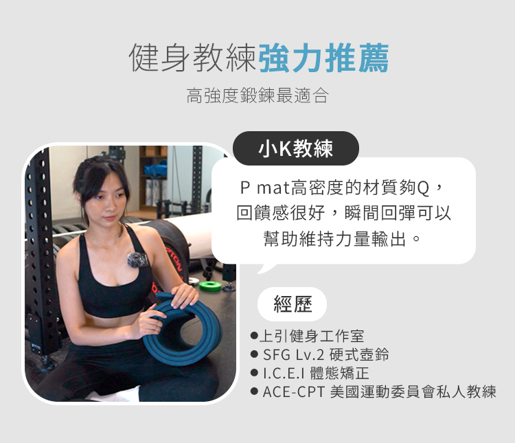 P Mat 是健身墊也是關節防護罩!擁有天然橡膠的止滑度和支撐力,卻比天然橡膠輕盈!獨家發泡技術讓健身墊保有超高彈性,再運用高密度科技加壓,大幅提升支撐性與扎實度,即使承受高強度衝擊也不會變形。無論是徒手健身、高強度間歇訓練、跳繩、超慢跑、伸展放鬆,P Mat 滿足你各種訓練需求!