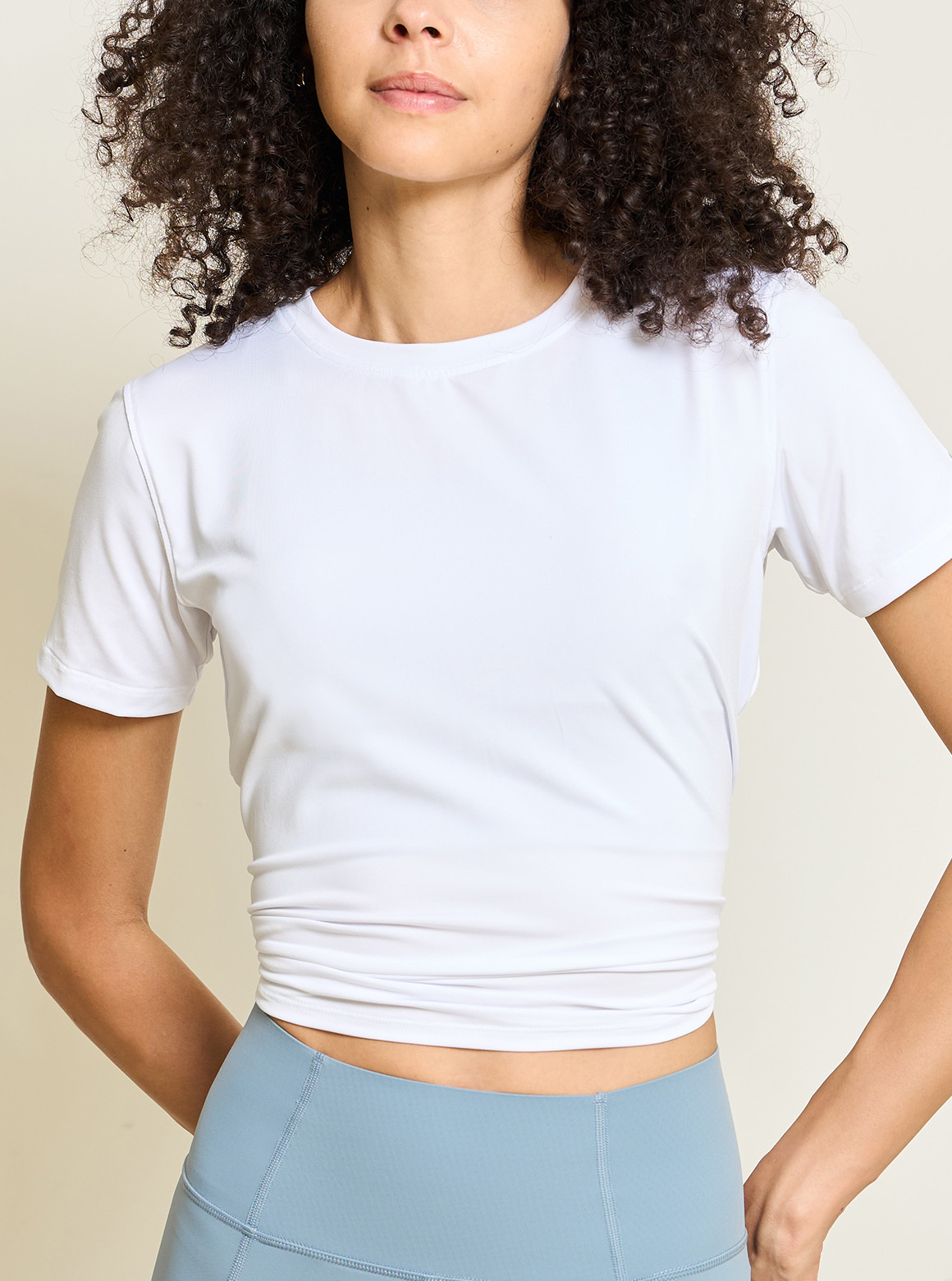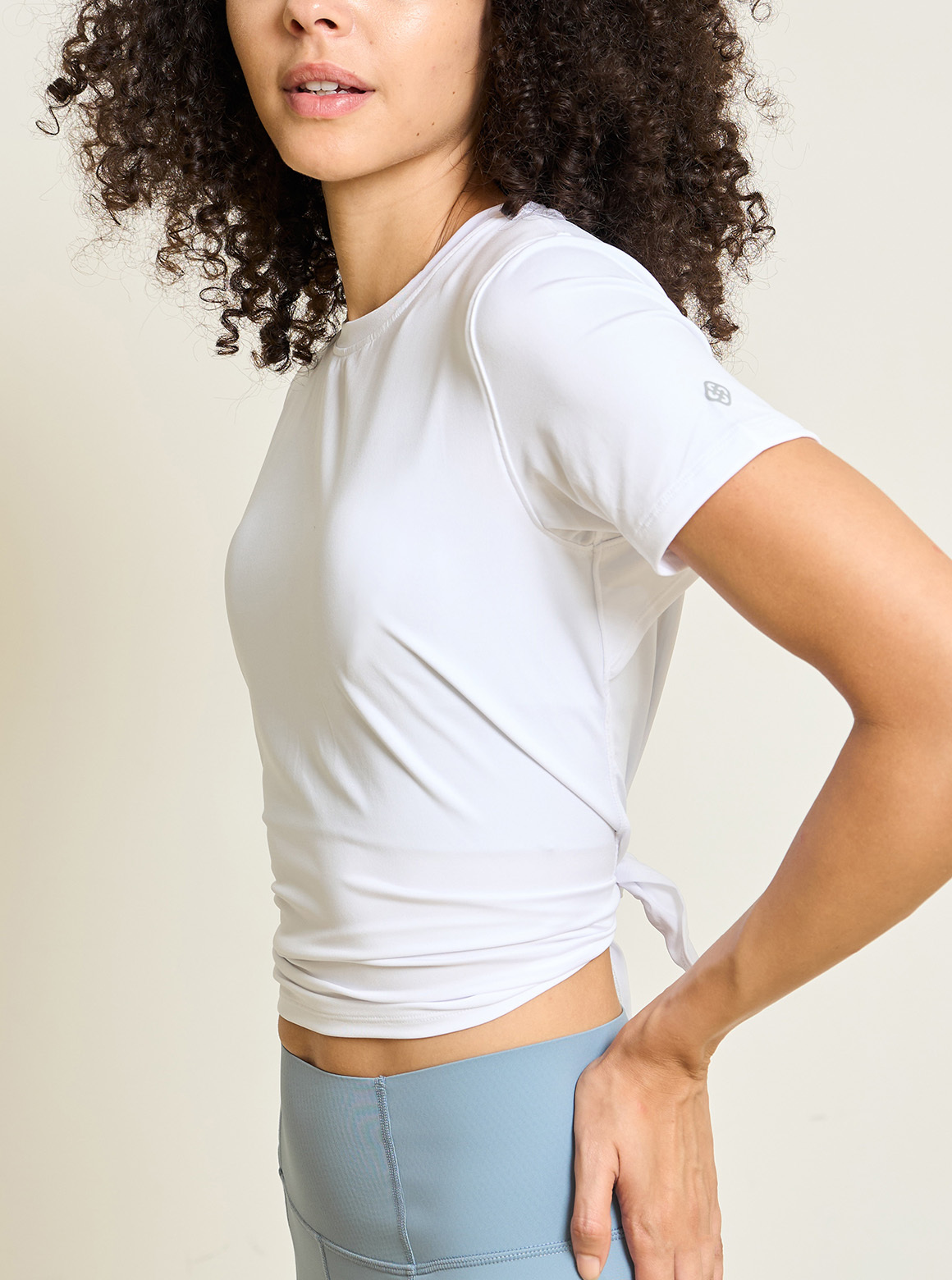 S2N經典上衣新款EVERYTHING FLOWS輕盈高彈性舒適布面,觸感柔順細緻,兼具除臭抗菌,長度恰到迷人五分袖長修飾多餘贅肉;設計兩穿:經典圓領下擺前短後長修飾線條,亦可扭結綁短凸顯腰部曲線亦可顯身拉長腿部比例,打造極度修飾版型,不僅適合運動更適合外出穿搭