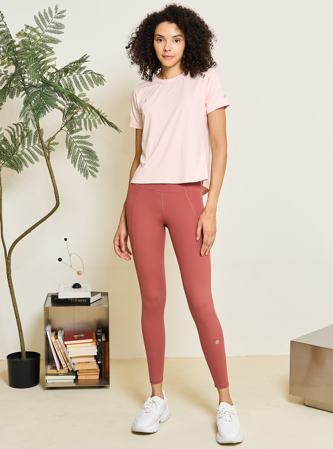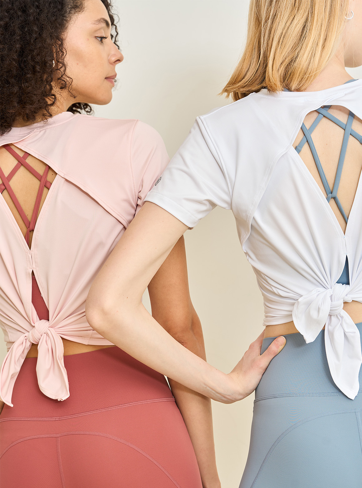 S2N經典上衣新款EVERYTHING FLOWS輕盈高彈性舒適布面,觸感柔順細緻,兼具除臭抗菌,長度恰到迷人五分袖長修飾多餘贅肉;設計兩穿:經典圓領下擺前短後長修飾線條,亦可扭結綁短凸顯腰部曲線亦可顯身拉長腿部比例,打造極度修飾版型,不僅適合運動更適合外出穿搭