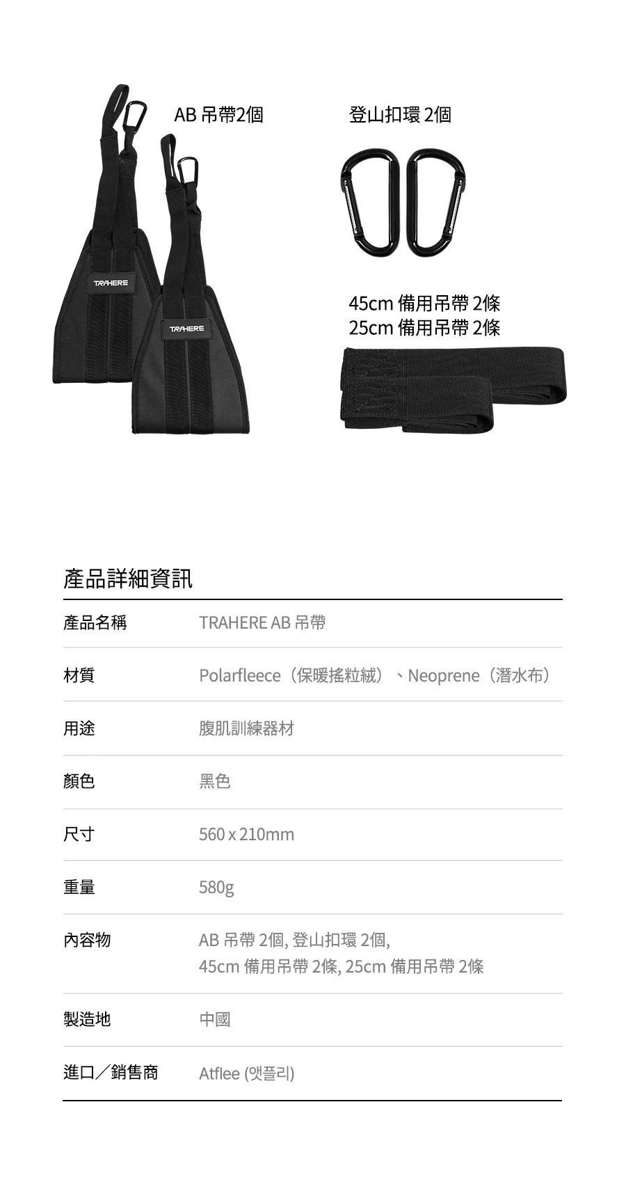 內含:AB 吊帶 x2、登山扣環 x2、45cm 備用吊帶 x2、25cm 備用吊帶 x2