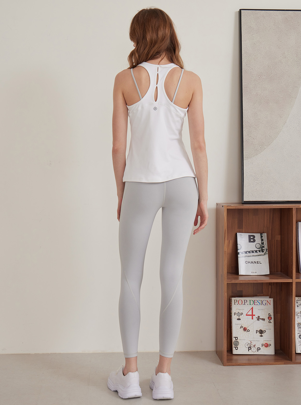 她穿著一件簍空透膚設計的背心