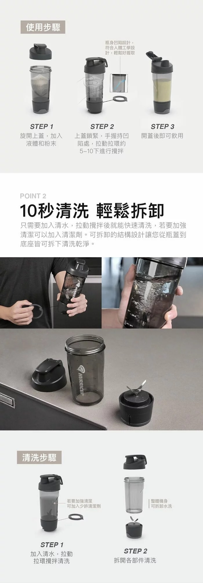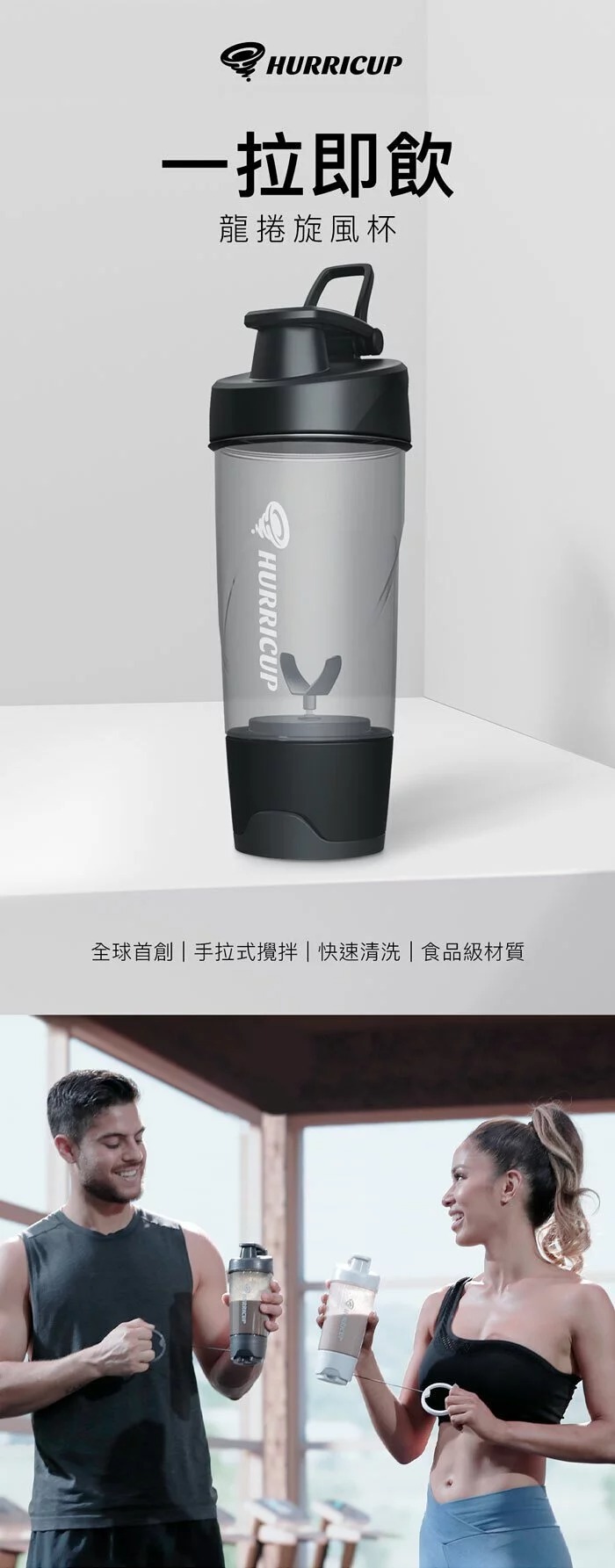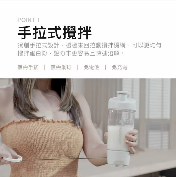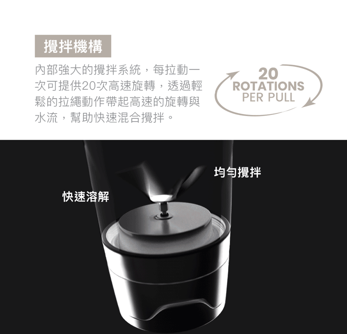 獨創手拉式設計,每拉動一次內部可高速旋轉20次!無需手搖、無需鋼球、免電池、免充電,透過來回拉動攪拌,可以更均勻攪拌乳清蛋白,讓蛋白粉快速溶解。