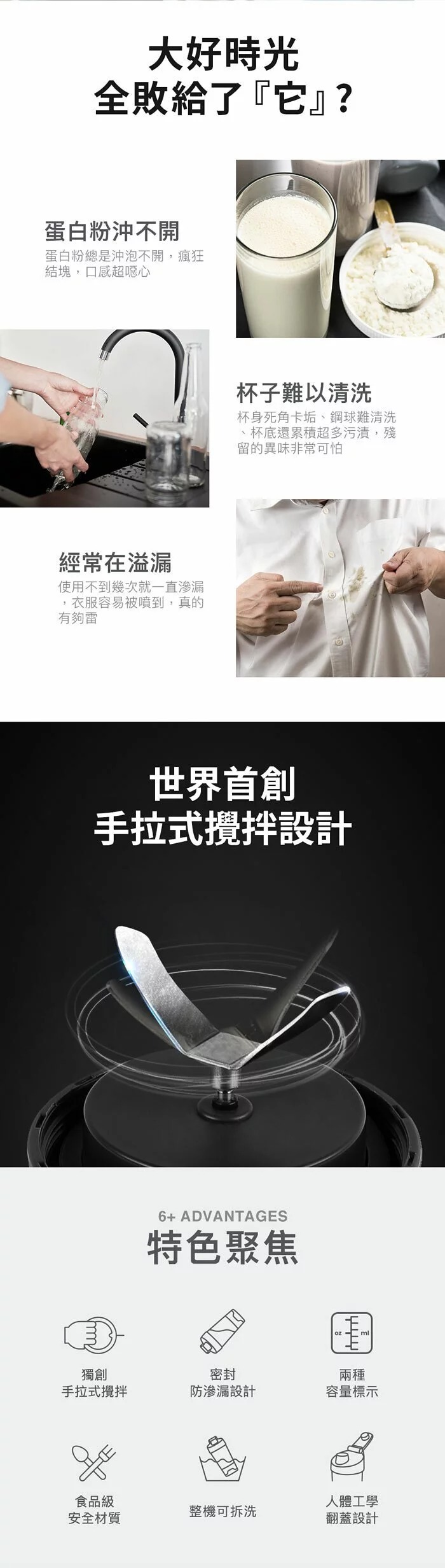 手拉式攪拌設計,可以輕鬆將液體、糊狀食物、乳清蛋白、麥片、代餐等攪拌均勻,就算使用冷水,依舊均勻不結塊。