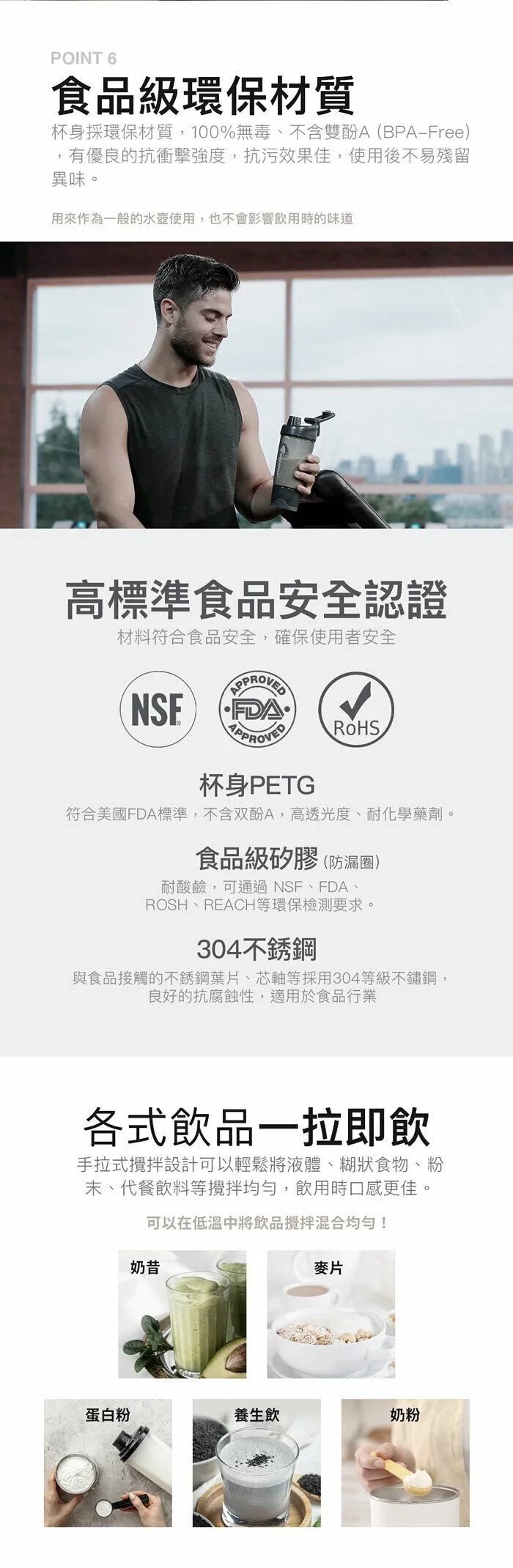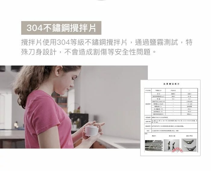 杯身PETG符合美國FDA標準,100%無毒、不含雙酚A(BPA-Free),高透光度,耐化學藥劑,防摔抗衝擊,抗汙效果佳,使用後也不容易殘留異味。食品級矽膠防漏圈,耐酸鹼,可通過NSF、FDA、ROSH、REACH等環保檢測要求。304不銹鋼葉片與芯軸,具良好的抗腐蝕性。