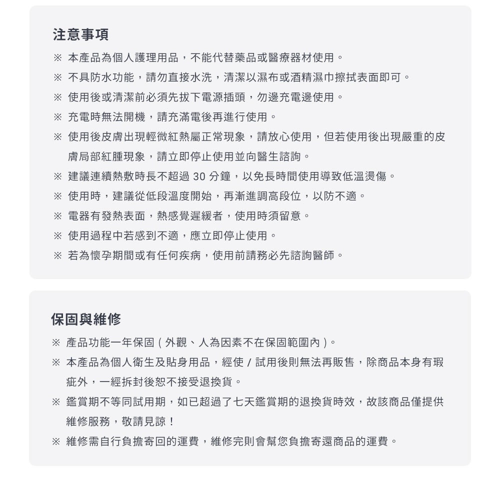 ※ 建議連續熱敷時長不超過 30 分鐘,以免長時間使用導致低溫燙傷。