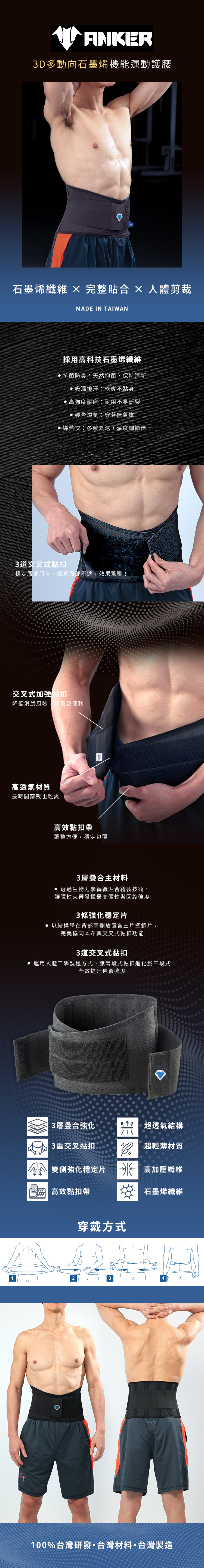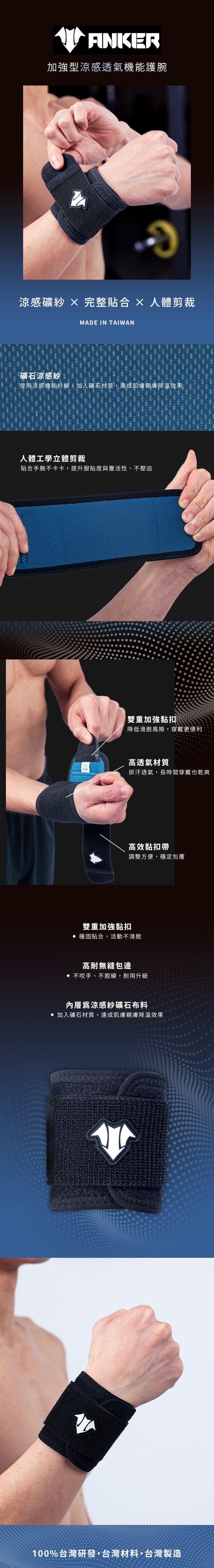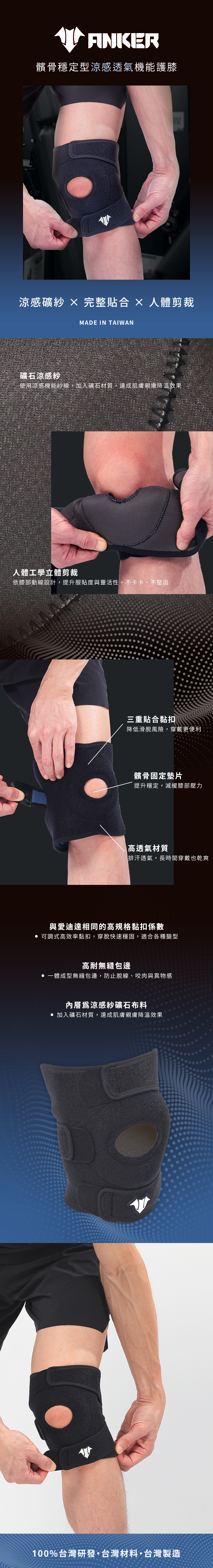 ANKER 專業運動護具,台灣研發、台灣材料、台灣製造,讓您從裡到外都放心!全系列採用高科技布料、人體工學立體剪裁 、高性能黏扣帶,讓運動變得更輕鬆舒適!