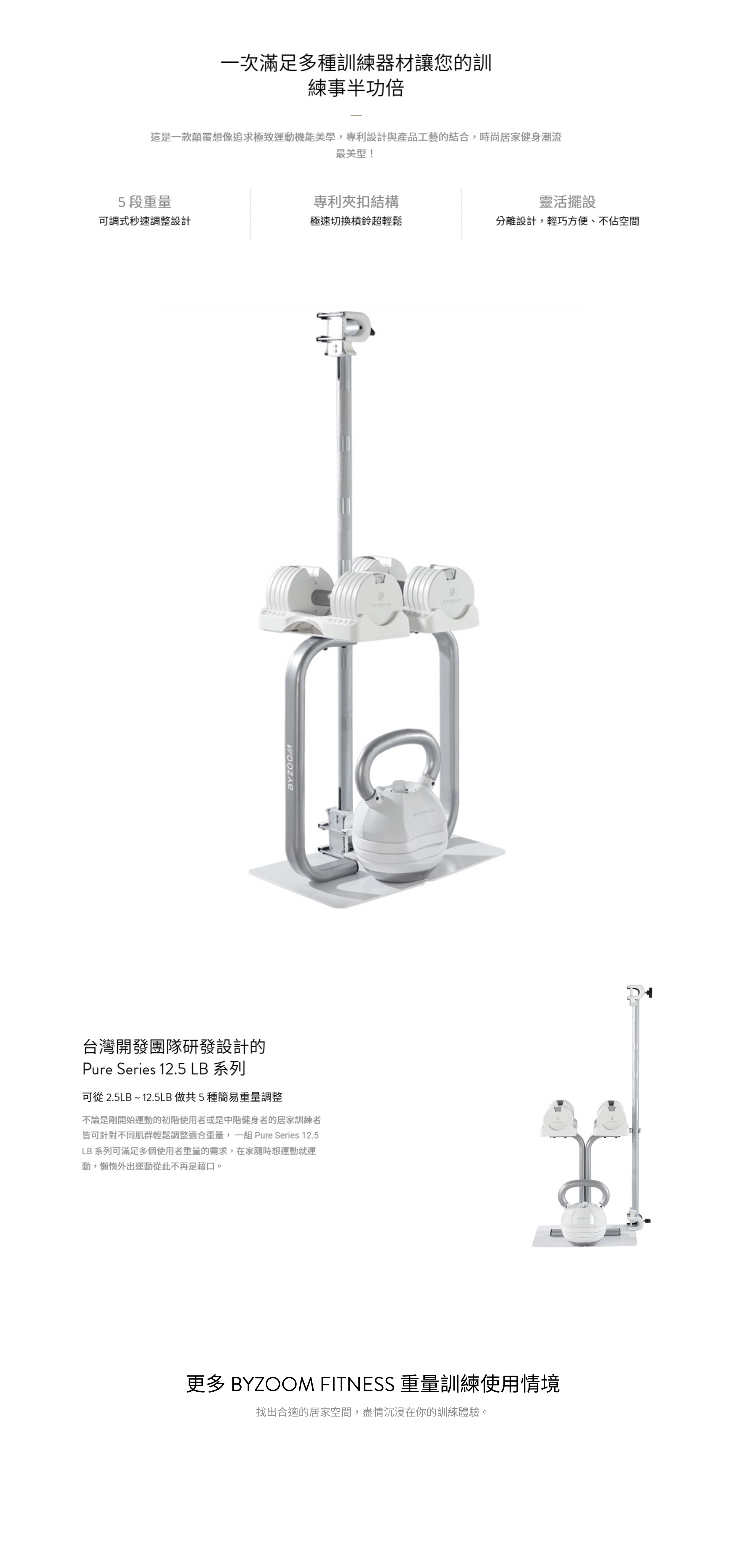● 3種可調式重量器材一次滿足訓練所需,五段重量秒速調整,居家健身新未來