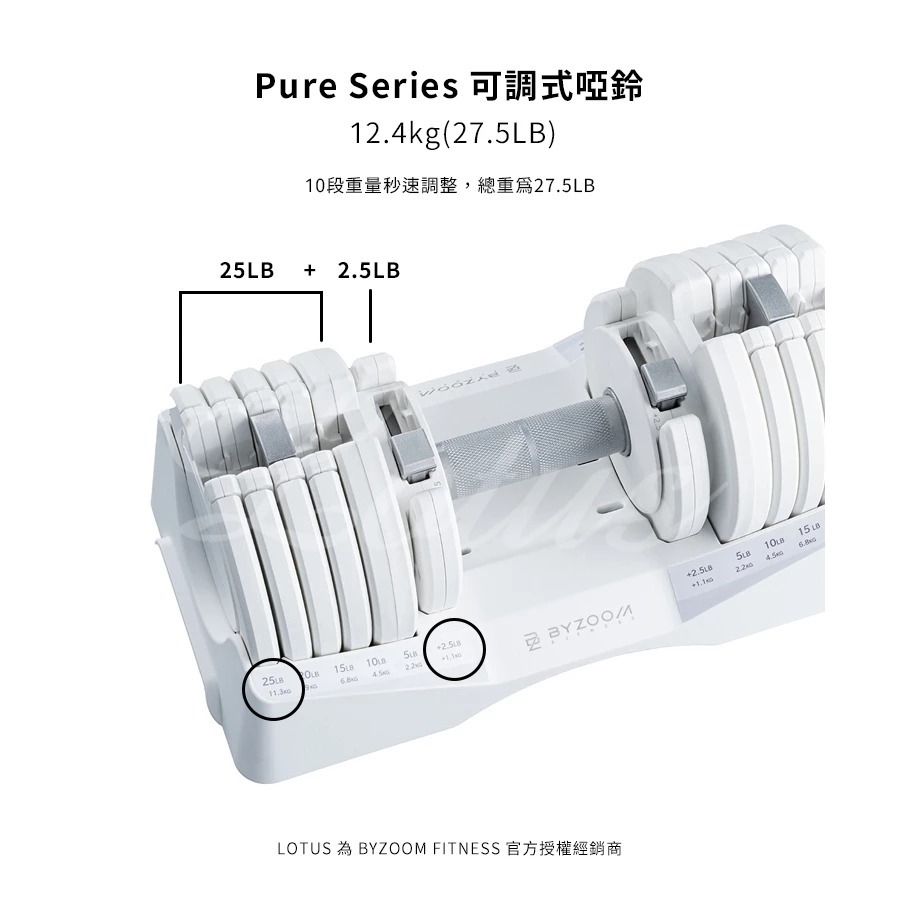 1組=12.5kg (27.5LB)調整啞鈴x1支、專屬底盤x1個