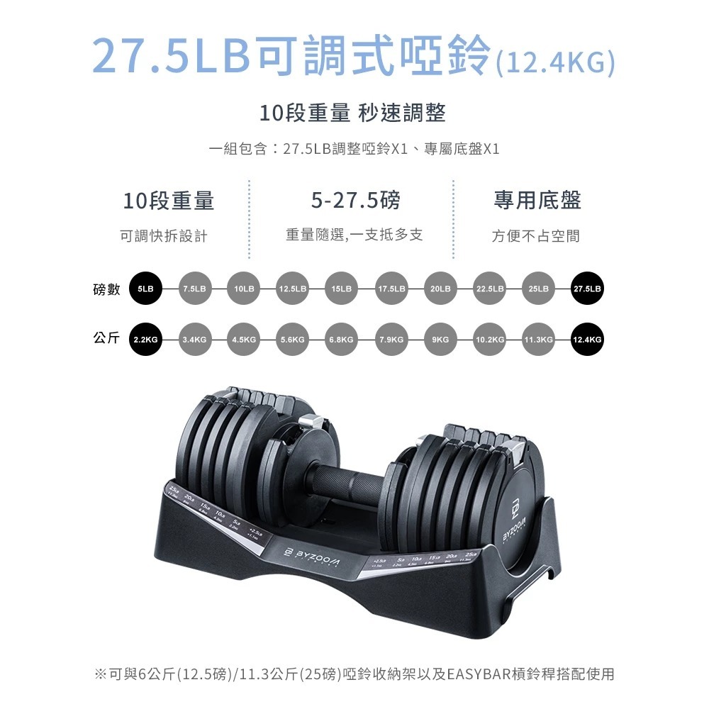 組合內含:12.5公斤(27.5磅)可調式啞鈴 x 2、13.6公斤(30磅)可調式壺鈴x1、啞鈴架x 1、Easy bar x 1