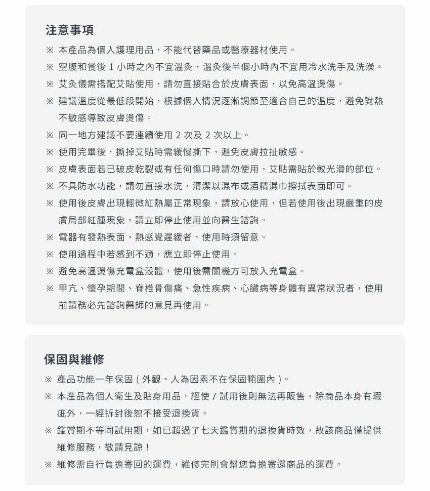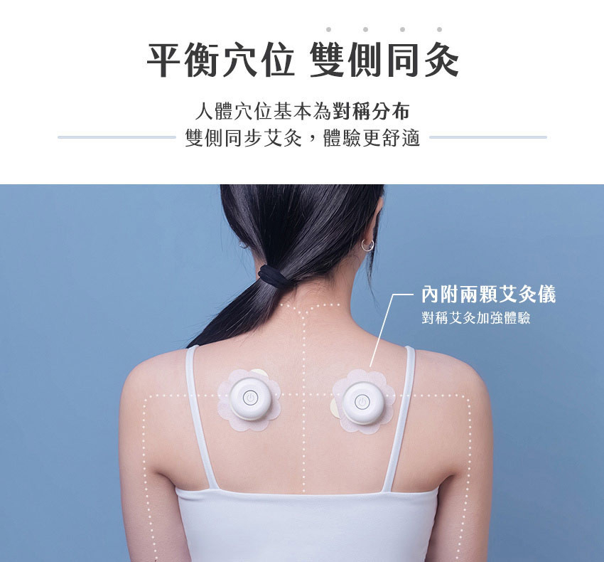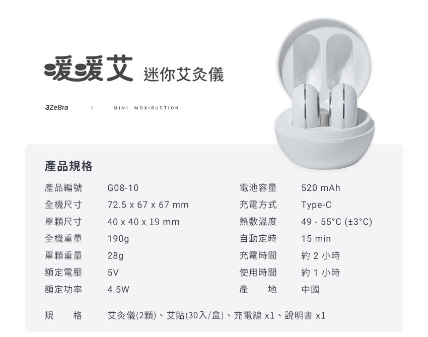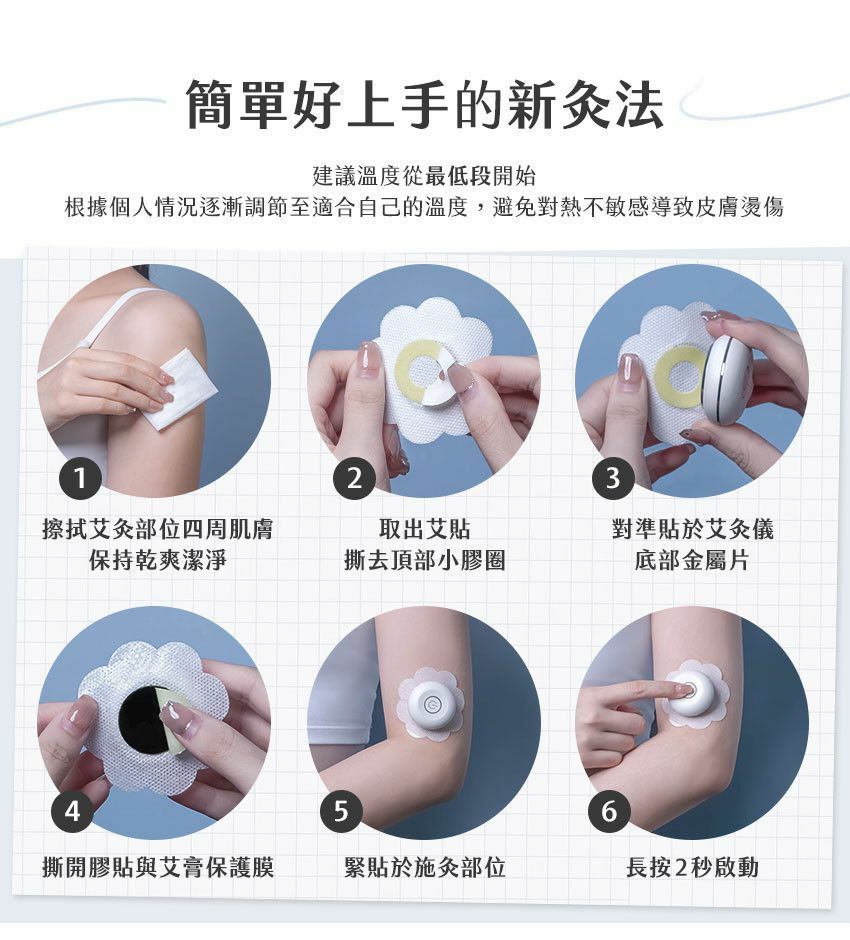 規 格:艾灸儀(2顆)、艾貼(30入 / 盒)、充電線 x1、說明書
