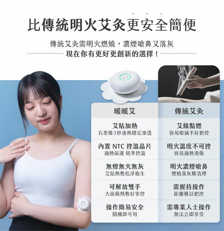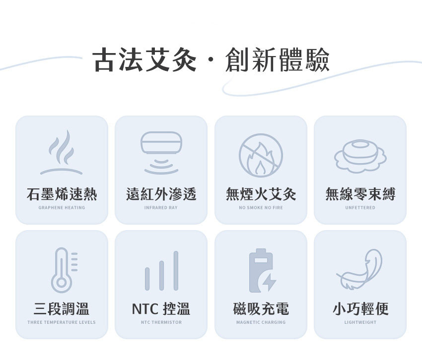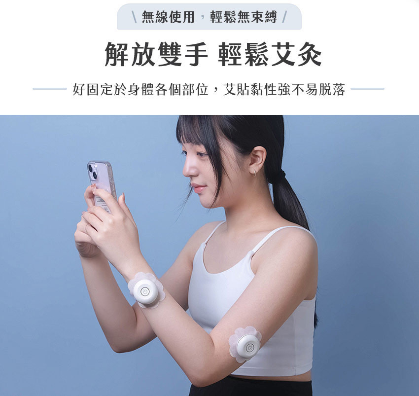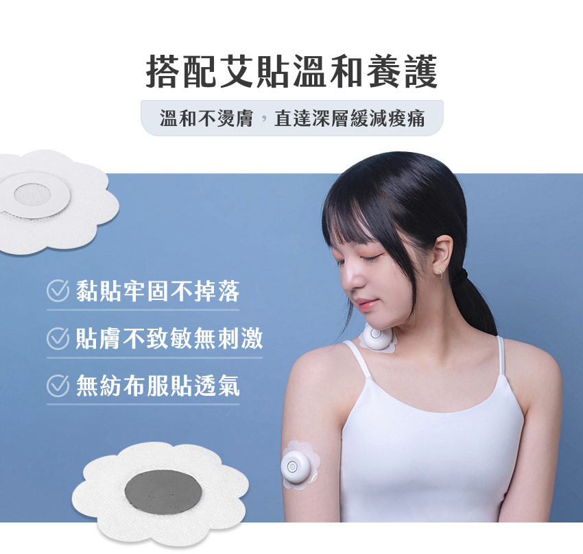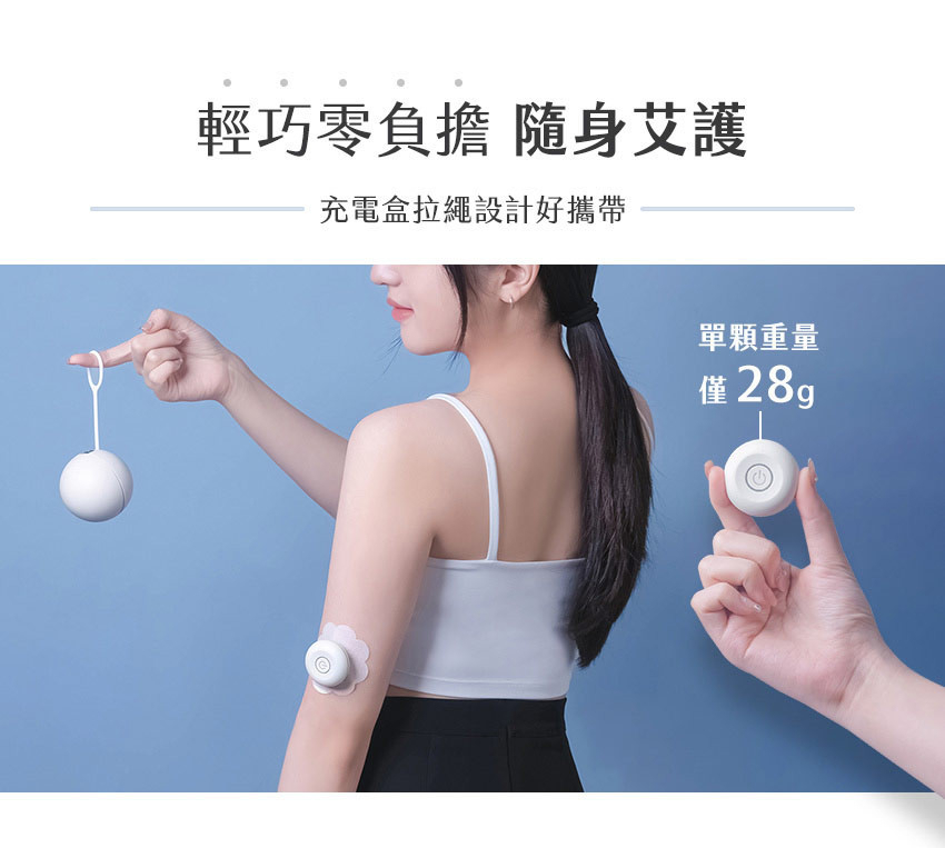 規 格:艾灸儀(2顆)、艾貼(30入 / 盒)、充電線 x1、說明書