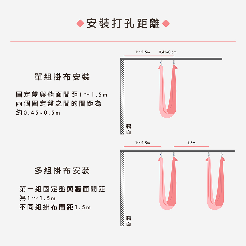 單組掛布安裝:固定盤與牆面間距1-1.5m,兩個固定盤之間的間距約為0.45-0.5m。