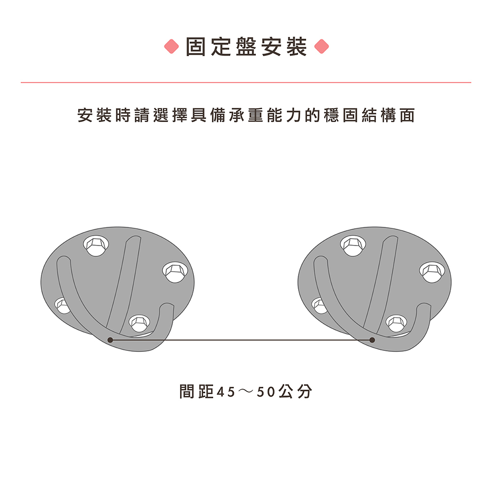 固定盤間距45-50cm,安裝時請選擇具備承重能力的穩固結構面。