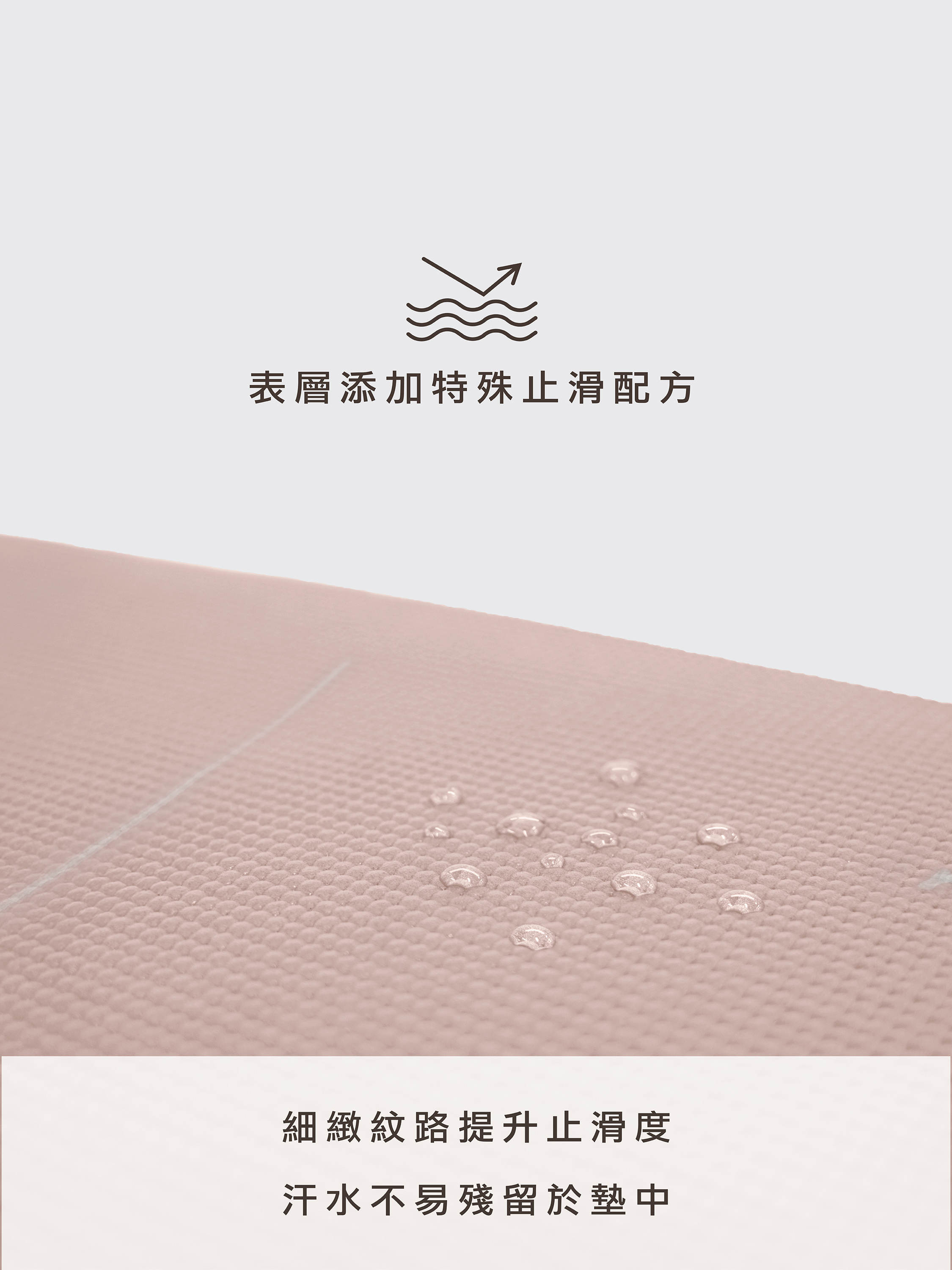瑜珈墊細緻止滑紋路,表層添加特特殊止滑配方,止滑效果更上一層樓。