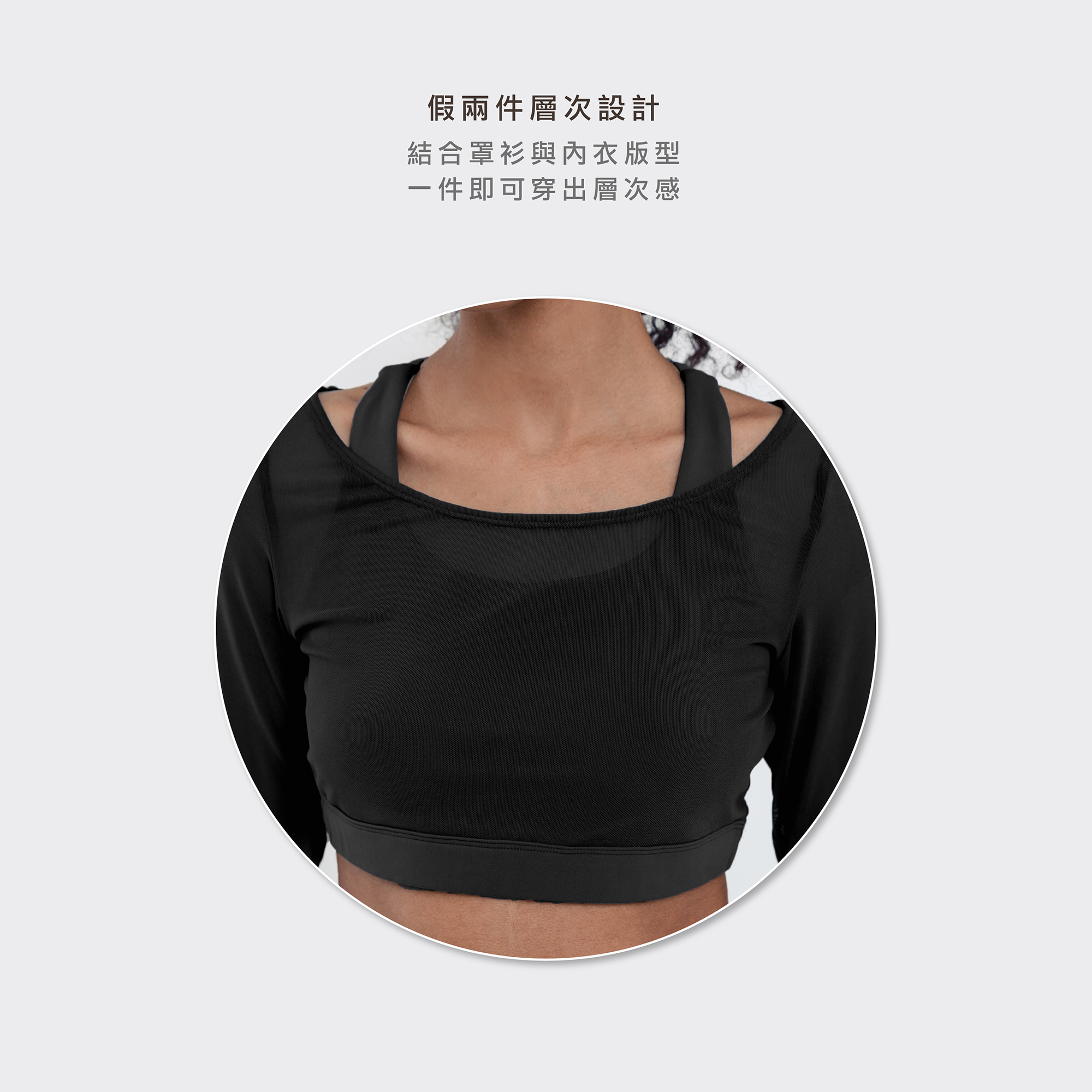 滑順的輕磅材質,超親膚的舒適手感,透膚網紗拼接,帶來舒適透氣感,隱約展現肌膚曲線,假兩件層次設計,結合罩衫與內衣版型,一件即可穿出層次感,美背結構設計,雙線交織,美化背部線條,抽換式立體胸墊,有左右之分設計,美形撐托,增加舒適感。