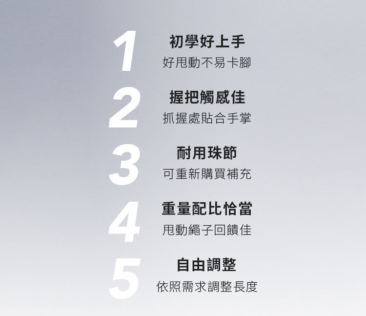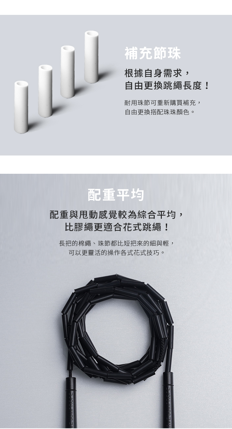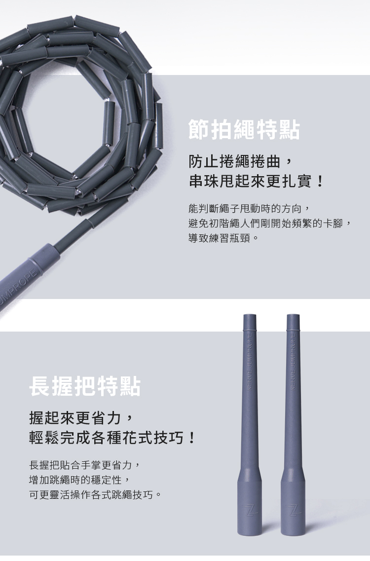 長把跳繩的優點:重量比短把輕,配重與甩動起來的感覺較「綜合平均」,同時可以耗費手部較少的力量。