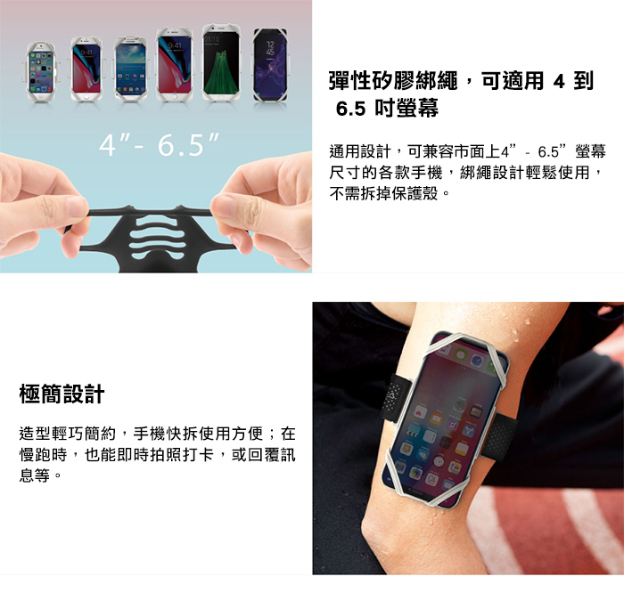 ● 彈性矽膠綁繩,可適用 4 到 6.5 吋螢幕