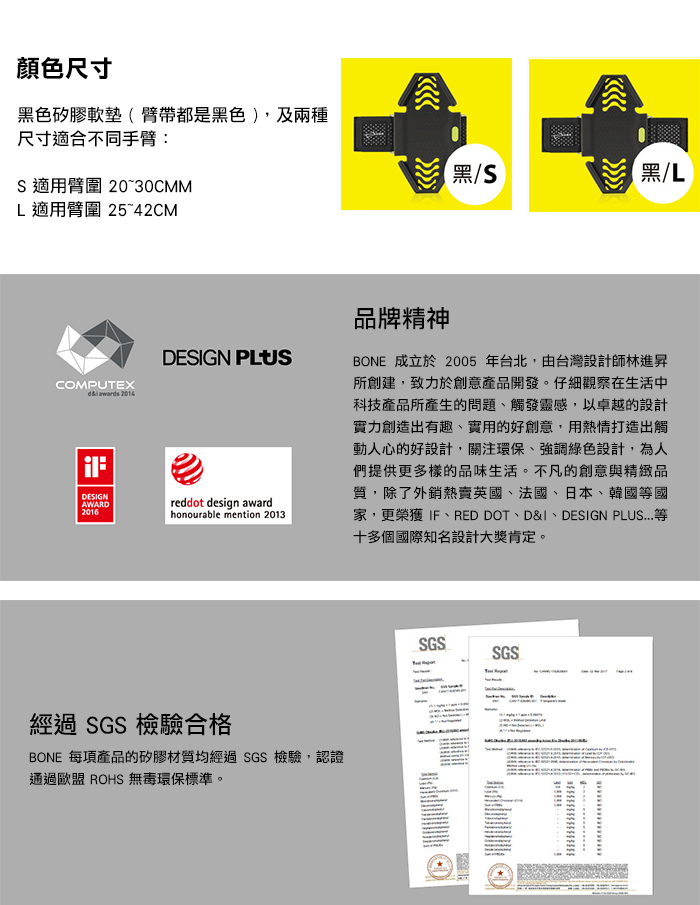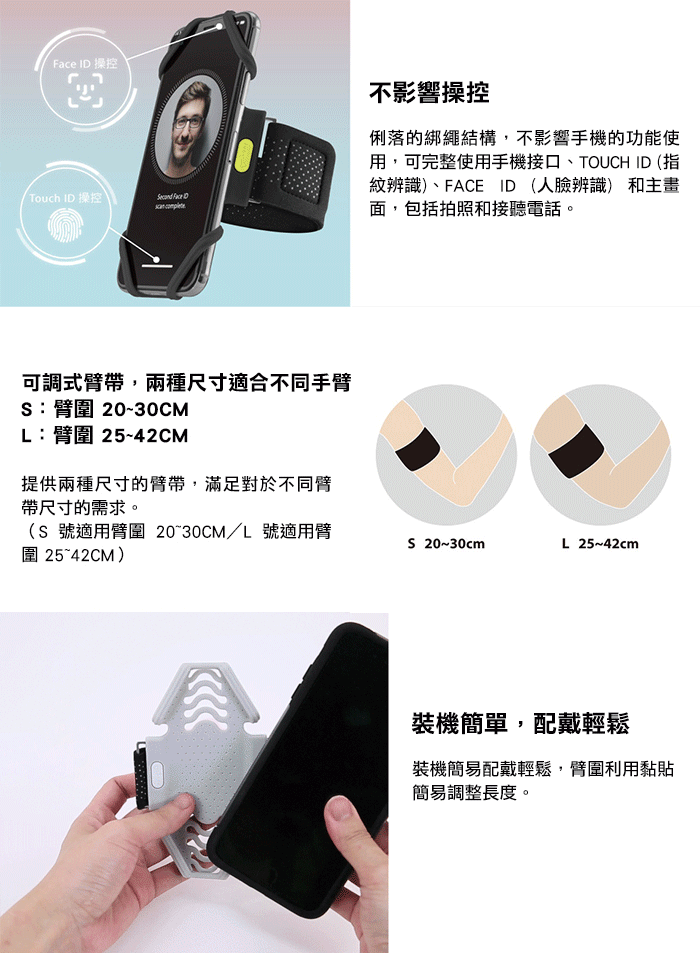 ● 提供 2 種尺寸的可調式臂帶,滿足 20 ~ 42cm 臂圍的跑者