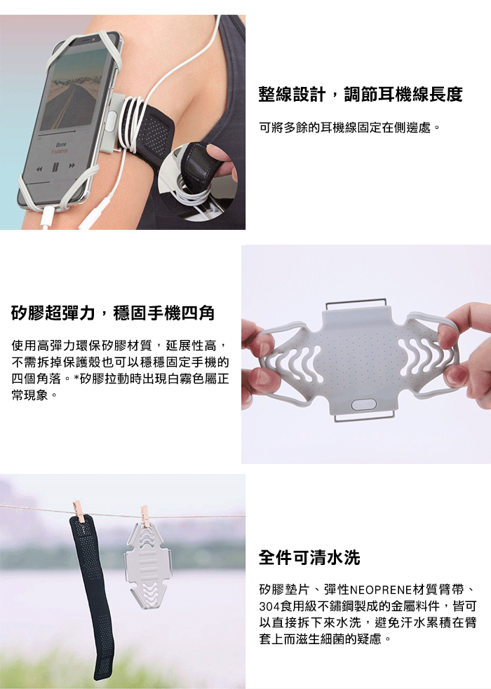 ● 矽膠墊片與彈性臂帶皆可以直接拆下來水洗,不易滋生細菌