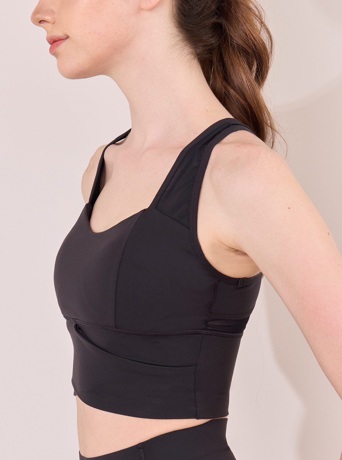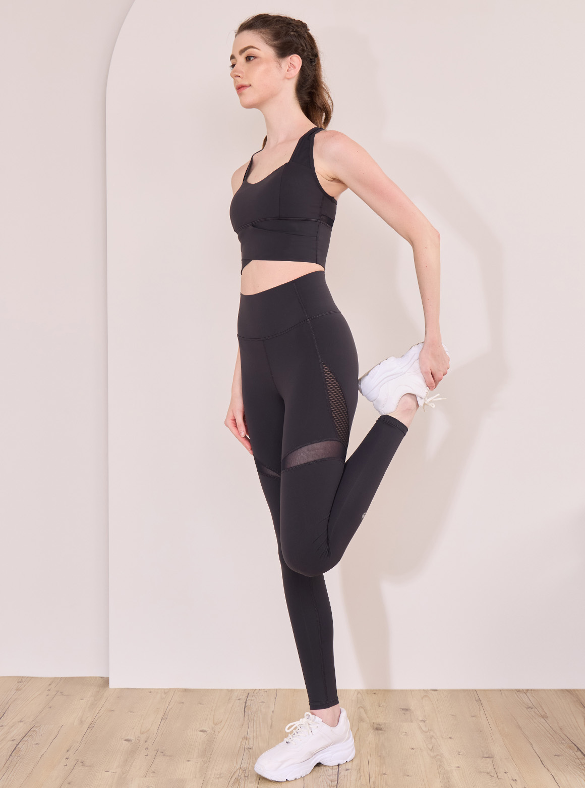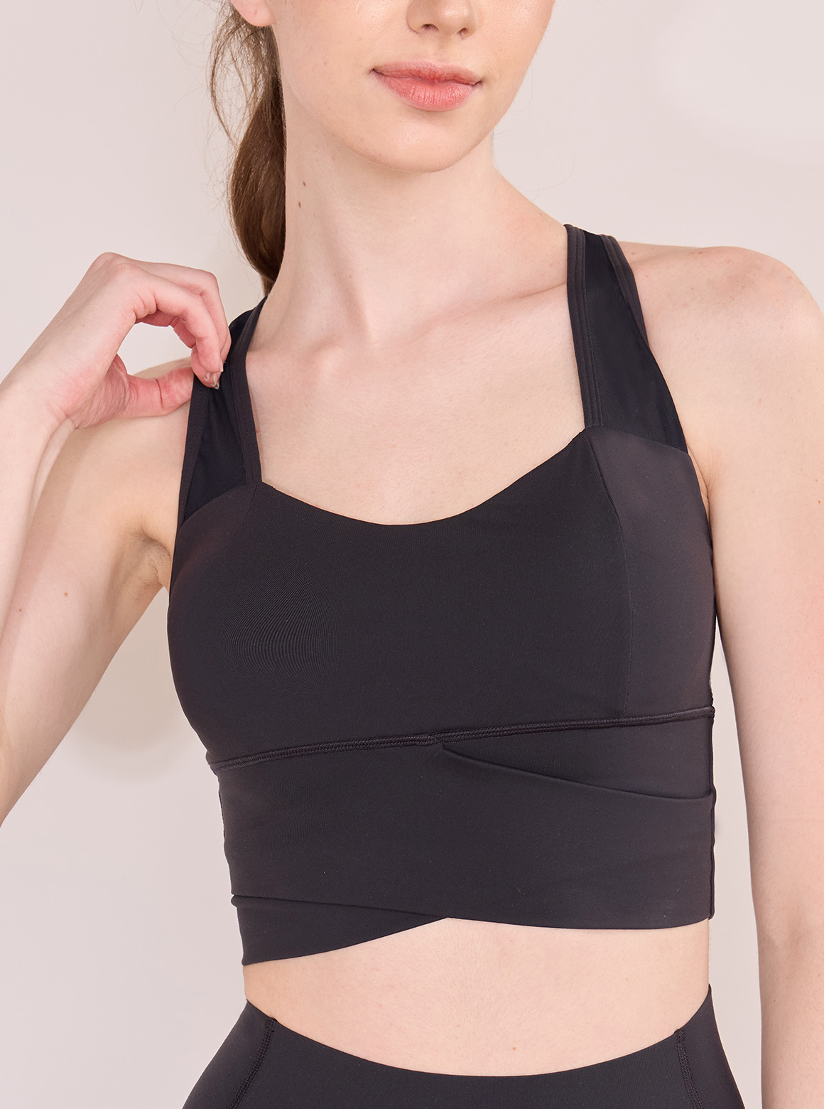 以透氣舒適網布剪接呈現出若隱若現的神祕感,在造型的謹慎的使用剪接的範圍以及寬度,在視覺上呈現極佳的交錯感。