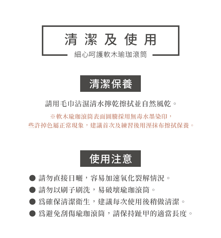 • 請勿以刷子刷洗,易破壞瑜珈滾筒。
