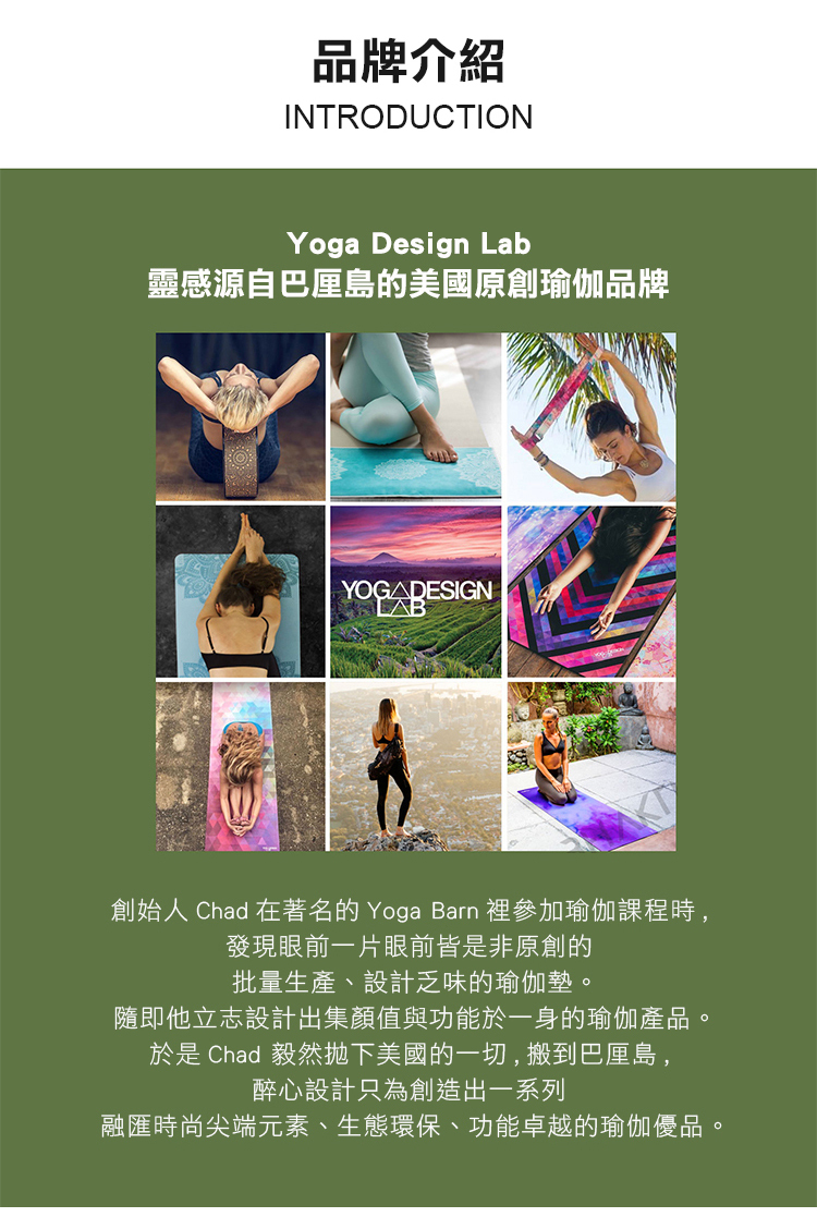 來自美國的Yoga Design Lab由創辦人Chad在峇里島上度假練習瑜珈時,感受到了峇里島當地自然的氣息,心想如何將眼前令人感到心悅的山海美景融入在瑜珈運動中。於是設計出了與市場上常見的素面瑜珈墊截然不同風格的亮豔天然橡膠瑜珈墊。集結專業與時尚的Yoga Design Lab很快的紅遍世界各國,登上各大知名瑜珈雜誌,它就這樣展開了如初衷一般的驚奇之旅。