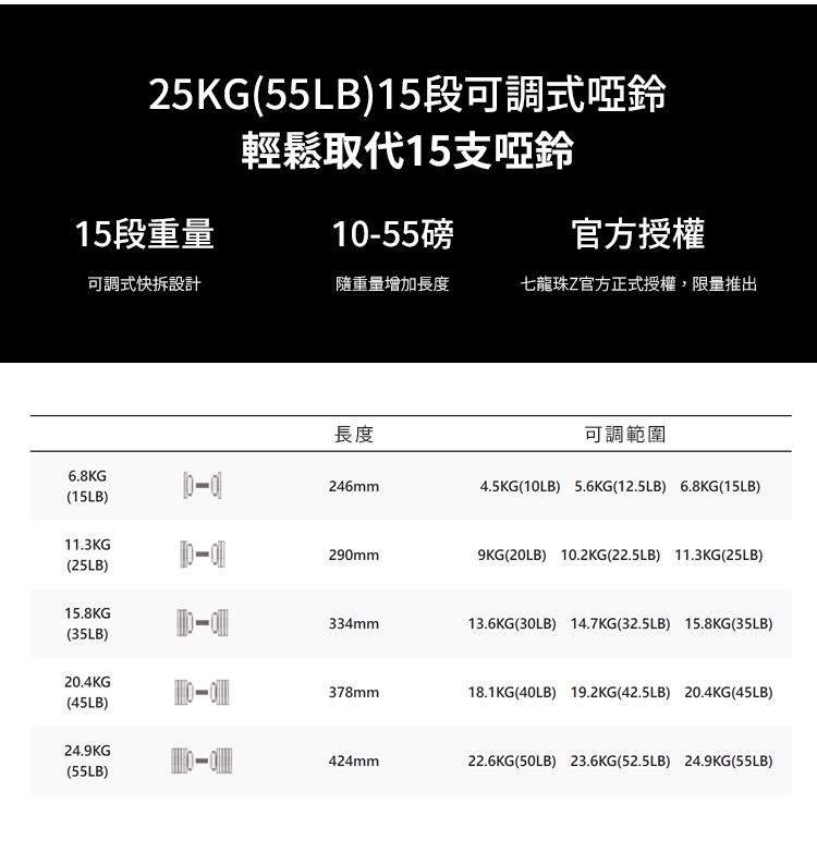啞鈴長度隨重量作改變,不受固定長度牽絆,多變訓練