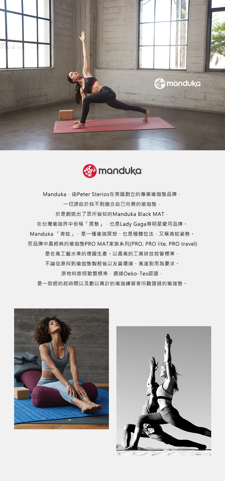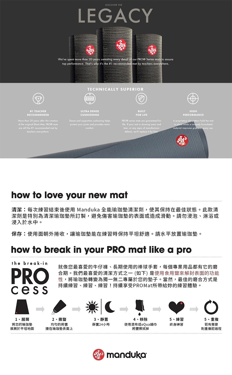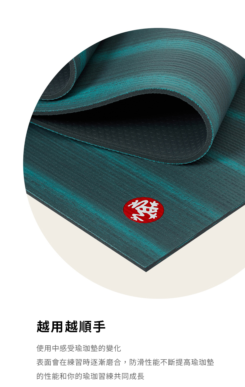 - Manduka PRO系列瑜珈墊是為了終身使用而設計,可降低整體PVC墊使用量。